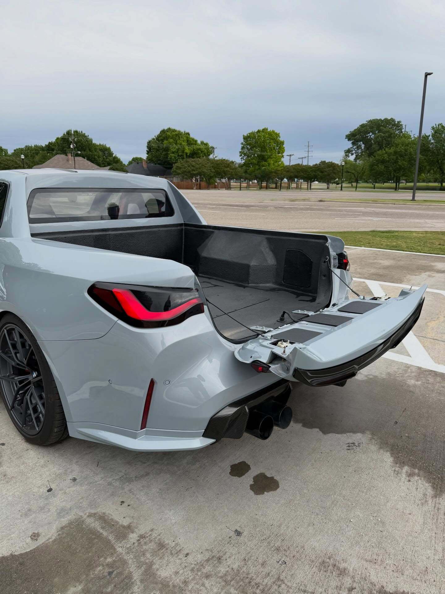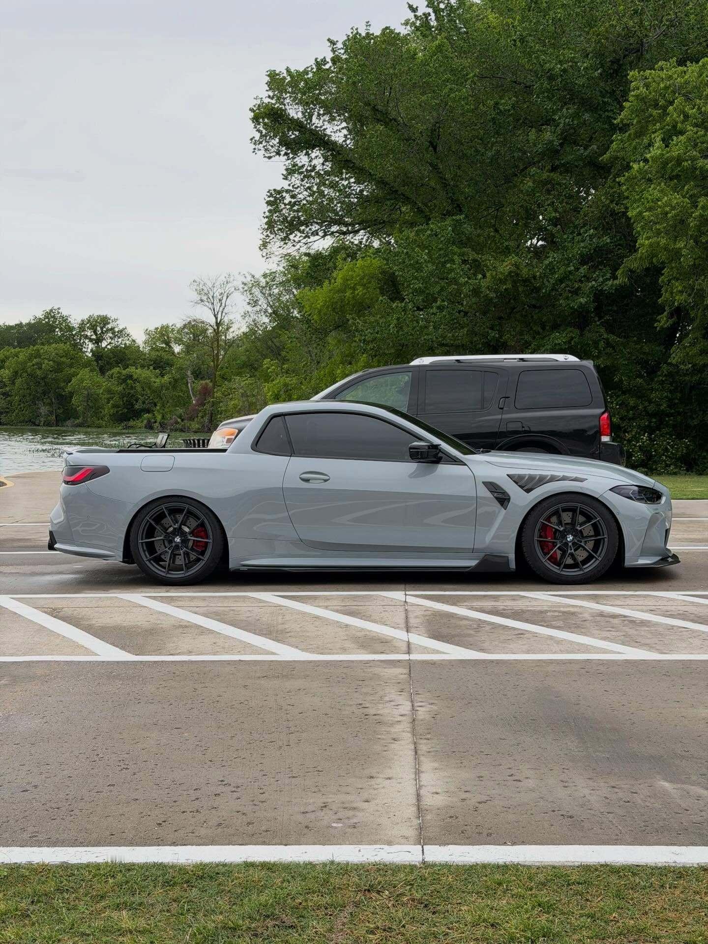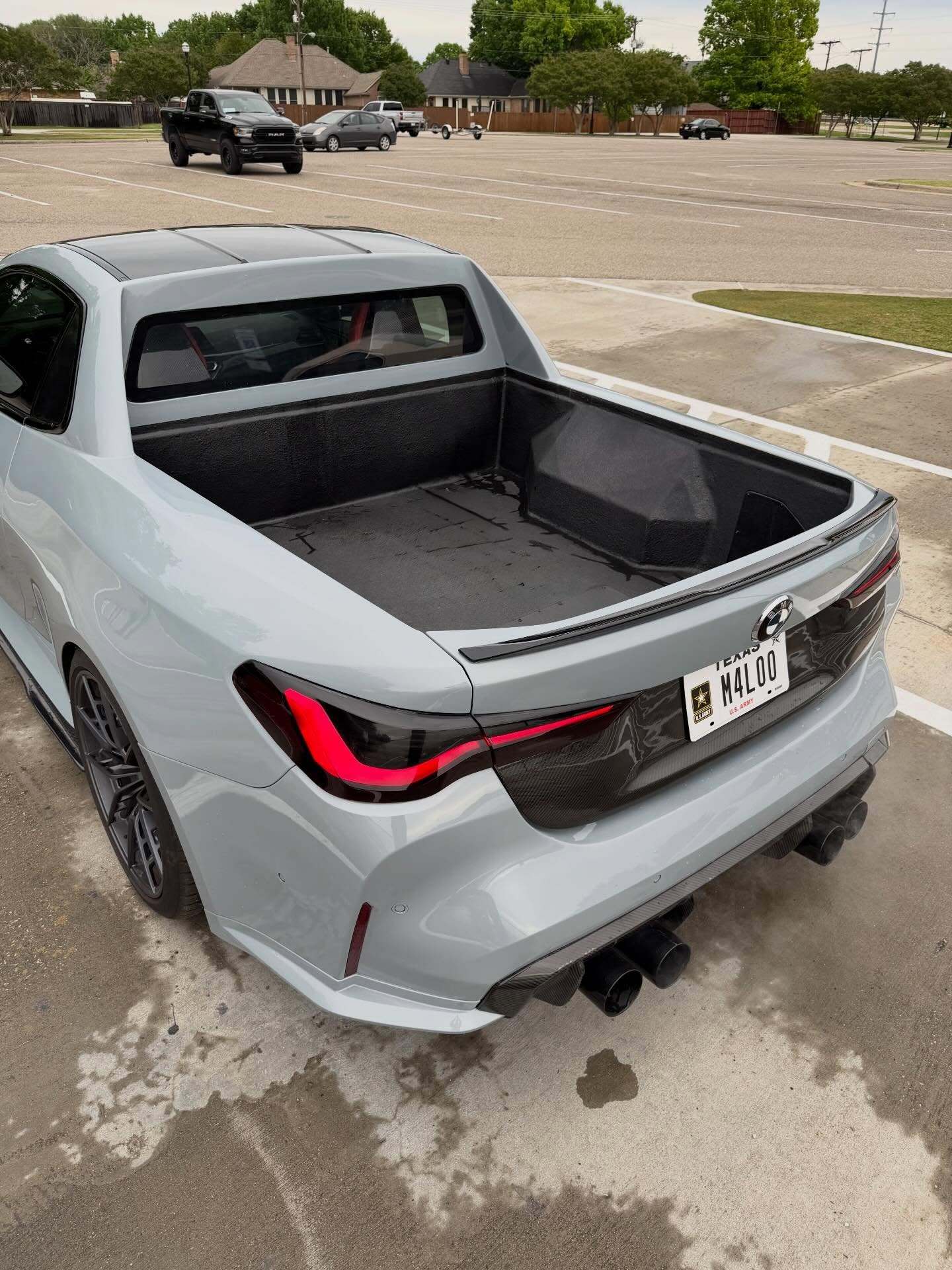 DinMann在改装过程中,并没有切到底盘大梁,而是切除了车身上部的结构,并重新焊接了防滚架级别的强化结构。为了美观和减重,整个后斗采用了全碳纤维内衬,这在皮卡改装中是非常罕见的奢侈配置。这台车的完成度非常高,特别是货箱部分的线条与G82 M4原有的腰线衔接得非常自然。尾部折叠门是完全重新设计的,可以看到它保留了M4标志性的尾灯和四出排气,低趴的车身,配合碳纤维的宽体套件,视觉冲击力极强。