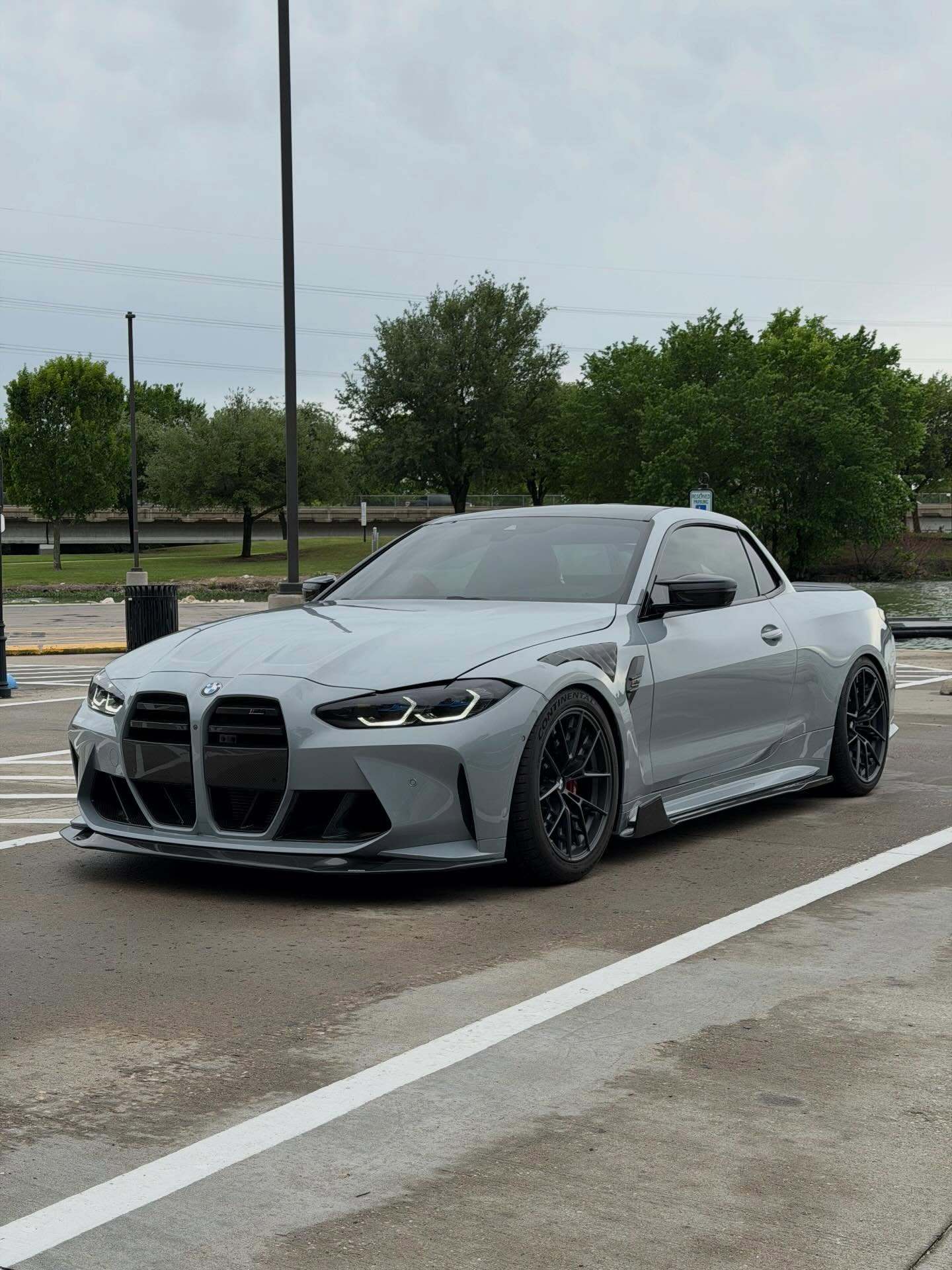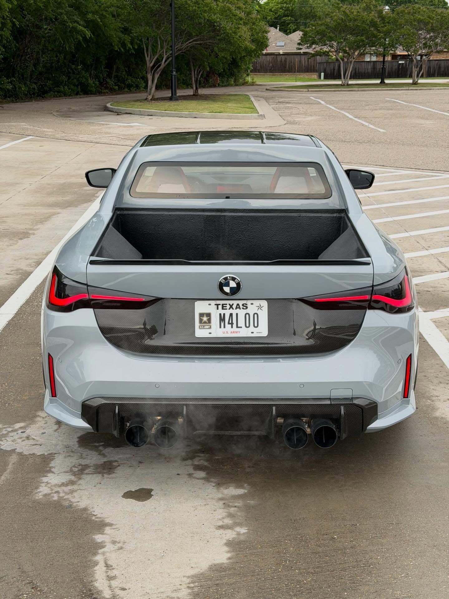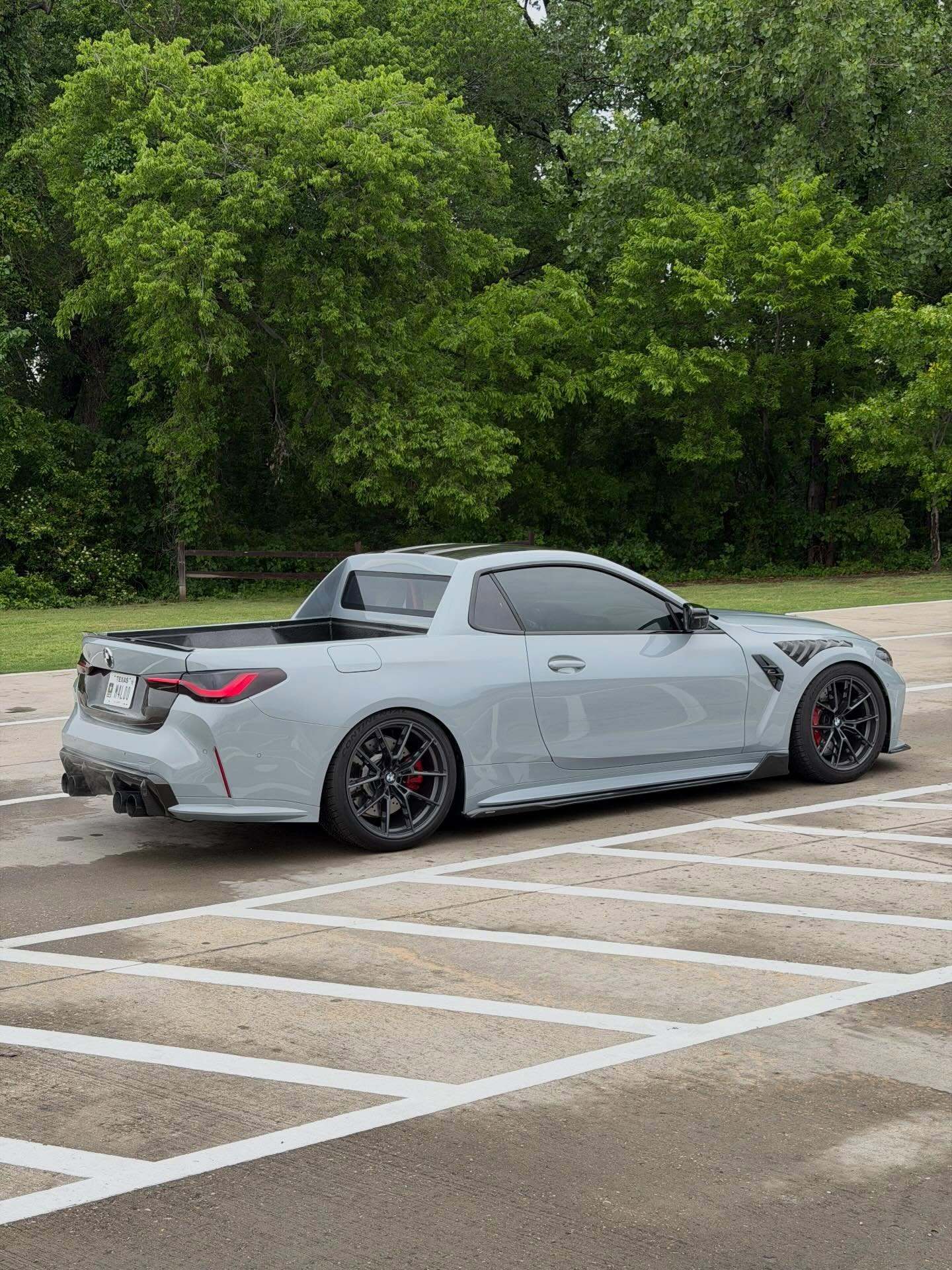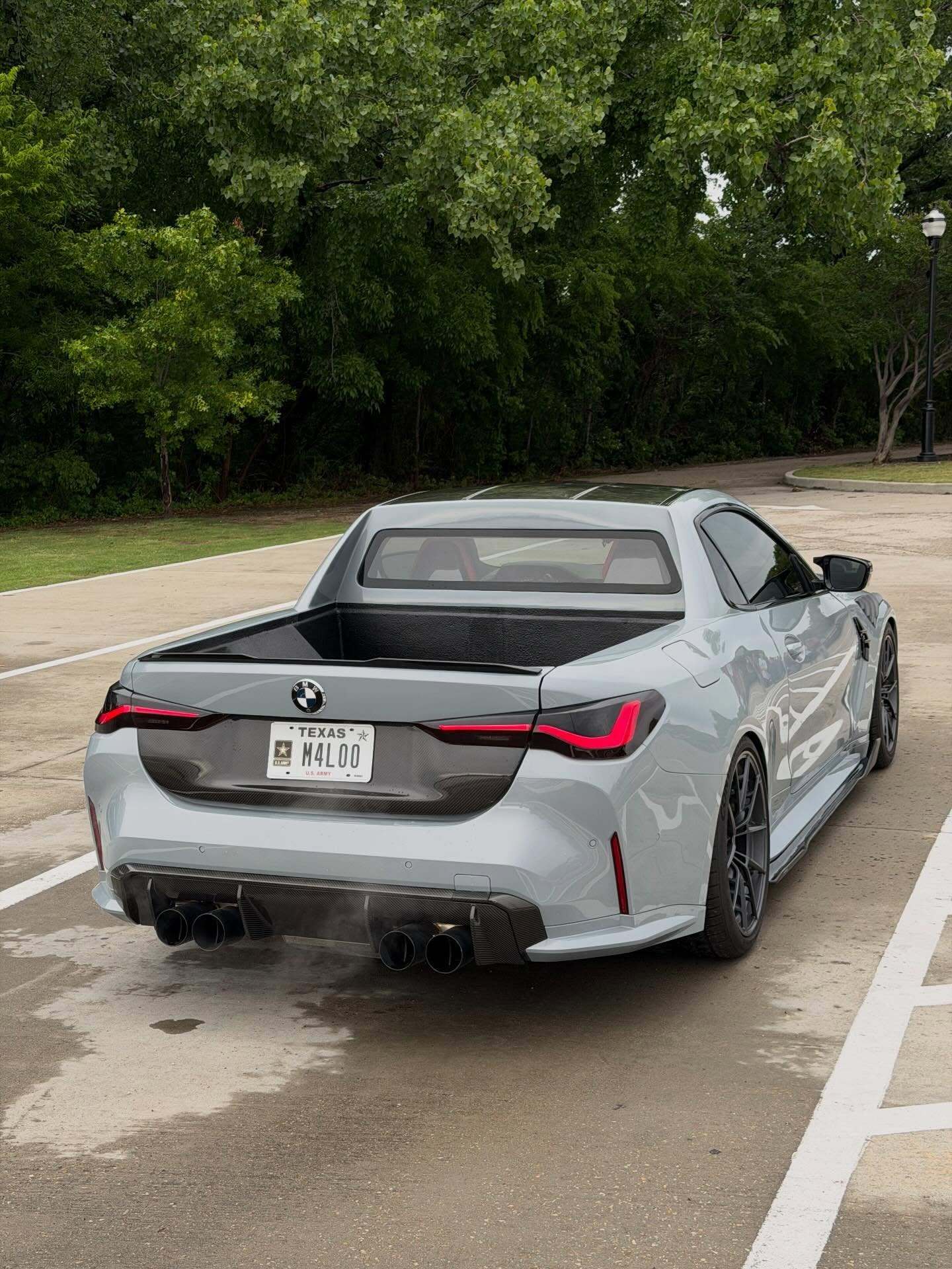 DinMann在改装过程中,并没有切到底盘大梁,而是切除了车身上部的结构,并重新焊接了防滚架级别的强化结构。为了美观和减重,整个后斗采用了全碳纤维内衬,这在皮卡改装中是非常罕见的奢侈配置。这台车的完成度非常高,特别是货箱部分的线条与G82 M4原有的腰线衔接得非常自然。尾部折叠门是完全重新设计的,可以看到它保留了M4标志性的尾灯和四出排气,低趴的车身,配合碳纤维的宽体套件,视觉冲击力极强。