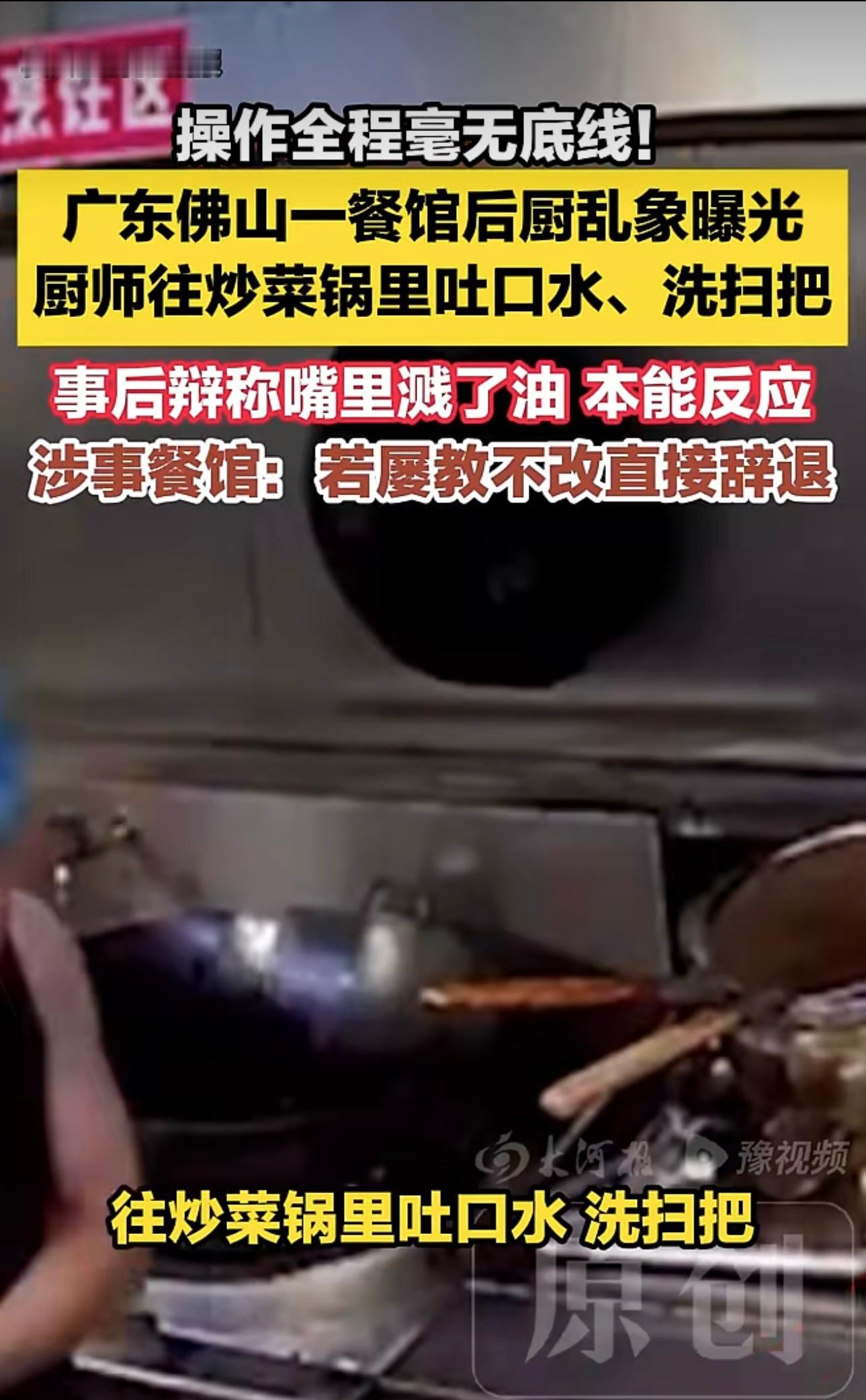操作全程毫无底线!广东佛山一餐馆后厨乱象曝光,厨师往炒菜锅里吐口水、洗扫把,涉事餐馆:若屡教不改直接辞退(视频来源:大河报、豫视频、看看新闻)