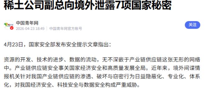 谁能想到,咱们引以为傲、能在全球横着走的“国之重器”,竟然被自己人给卖了?4月23日,国家安全部披露的一桩惊天大案,直接把大伙儿看出一身冷汗。一家稀土公司的副总见钱眼开,竟把7项绝密数据打包送给了境外机构,这就好比咱们正跟对手在牌桌上梭哈,底牌却被内鬼掀了个底朝天! 稀土作为我国战略性矿产资源,是支撑高端制造、国防军工、新能源等关键领域发展的核心命脉,其产业安全直接关联国家战略安全。 一场由内鬼勾结境外势力引发的机密数据泄露案,将我国稀土产业的安全隐患彻底暴露,揭开了境外势力针对我国战略资源的隐蔽窃密真相,其危害与警示值得全社会高度警惕。 国家安全部于 4 月 23 日公开的这起稀土泄密案,并非简单的个人贪腐,而是境外势力精准布局、长期渗透的结果。 涉案核心人员成某,时任国内某稀土骨干企业副总经理,凭借职务权限,长期接触稀土收储、生产调度等核心领域的机密信息,这一岗位正是境外势力长期瞄准的渗透目标。 与成某勾结的叶某某,身为境外某有色金属企业中方雇员,是境外势力安插的 “窃密棋子”,专门对接内鬼、传递机密,形成了完整的境外窃密、内鬼输送黑色链条。 此次泄露的 7 项稀土机密数据,是我国稀土战略储备的 “核心密码”,包含收储品类、数量、价格、指令性生产计划等关键内容。 直接影响我国在全球稀土市场的定价权与主导权,关联战略资源调控秩序,其损失远超经济层面,直接威胁国家资源安全与产业安全。 我国稀土产业的优势,既在于资源储量的先天优势,更在于完备的产业体系与核心技术壁垒。 公开权威数据显示,我国稀土储量占全球 48%(2024 年 USGS 数据),稀土矿产品产量占全球 69.2%,冶炼分离产能占全球 92.3%,精加工产能占全球 92% 以上,形成了从开采到终端应用的完整产业链。 我国在稀土萃取、提纯分离领域拥有自主核心知识产权,可实现规模化高纯度量产,欧美多国虽保有稀土矿产资源,但缺失成熟冶炼加工体系,长期依赖我国稀土深加工产品,这也是境外势力蓄意窃密的核心动因。 成某的泄密绝非偶然,背后折射出部分重点企业保密管理体系的严重漏洞。 境外势力通过长期摸排,掌握了成某贪慕虚荣、急于为亲属谋求境外生活的心理,以非法获利 51 万美元为诱饵,逐步腐蚀拉拢、突破其思想防线。 成某从试探性泄露非敏感信息,逐步演变为主动违规传输内部机密资料,涉事企业核心岗位保密监管缺位、制度执行松散,为境外窃密行为提供了可乘之机。 国家安全机关的侦查工作,彰显了对国家战略资源安全的严密守护。 办案人员在日常国家安全风险排查中,发现稀土行业敏感数据异常外流线索,通过核查资金往来、通讯联络、人员交往等多条线索,固定完整涉案证据,依法抓获成某、叶某某等涉案人员,查封涉案非法获利,彻底斩断跨境窃密输送链条。 成某到案后如实供述违法犯罪事实、当庭悔过,但其行为已触犯国家安全相关法律,必须依法接受严厉惩处。 2023 年 11 月,南昌中院依法作出判决,成某因犯为境外非法提供国家秘密罪、受贿罪,被判处有期徒刑十一年六个月,并处没收财产及罚金。 这起泄密案并非个例,近年来境外势力针对我国战略资源、重点产业、核心领域的渗透策反与情报窃取活动愈发隐蔽。 国家安全部本次同步公布稀土案、半导体案、产业链渗透案多起产业领域窃密渗透典型案例,多次曝光境外势力拉拢策反内部人员的作案模式,时刻警示各行各业,核心机密与关键信息守护容不得丝毫松懈。 境外势力窃取稀土核心机密数据,核心目的不局限于商业竞争利益,更意图预判我国稀土产业调控政策,干扰国际稀土市场交易秩序,扰乱产业链供应链稳定,借机挤压我国战略资源产业发展空间,遏制相关优势产业稳步发展,背后图谋极具针对性与危害性。 此次泄密案凸显了我国战略资源保密工作的紧迫性。 手握行业关键信息、涉密权限的从业人员,需摒弃贪念、坚守法律与底线,自觉抵制境外各类利益拉拢与渗透腐蚀。 稀土是我国的国之重器,是国家长远发展的战略底气,绝不能因个别人员的贪欲失守与企业管理疏漏,损耗长期积累的产业竞争优势。 唯有常态化筑牢全民保密防线、从严从重打击叛国窃密行为、压实企业主体责任,才能切实守护好我国战略资源安全,为高端制造升级、国防现代化建设筑牢坚实安全屏障。 如果各位看官老爷们已经选择阅读了此文,麻烦您点一下关注,既方便您进行讨论和分享,又能带来不一样的参与感,感谢各位看官老爷们的支持!