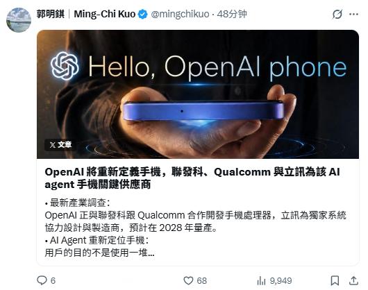 【郭明錤:OpenAI 联手高通 & 联发科打造手机芯片,2028 年量产】分析师郭明錤透露,OpenAI 正与联发科、高通合作开发手机芯片,立讯精密为独家制造伙伴,预计 2028 年量产。这款 AI 手机将颠覆现有交互逻辑,用户无需打开 App,直接通过手机执行任务。AI 智能体将成为核心,端侧小模型与云端大模型协同工作。OpenAI手机AI芯片