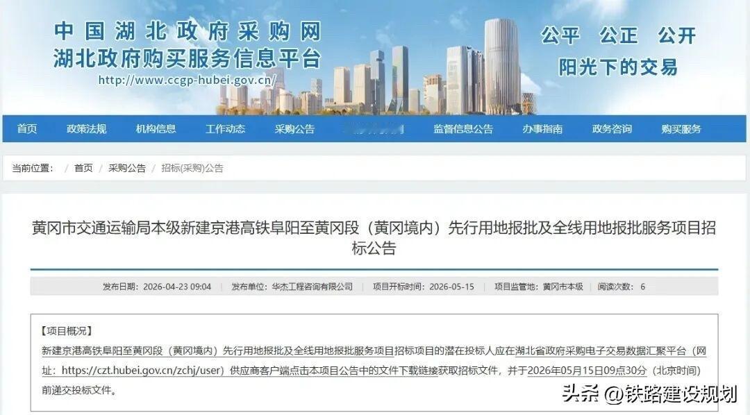 新建京港高铁阜阳至黄冈段(阜黄高铁)已进入开工前关键准备阶段,湖北段用地报批工作正式启动,结合施工图审核招标完成情况,项目年内正式开工基本确定,计划2030年前后建成通车。 本次招标:预算金额743万元,要求90天内完成先行用地报批、270天内完成全线用地批复,为施工扫清土地障碍。 此前,湖北段施工图审核招标已于4月15日完成公告,安徽段施工图审核招标更早于3月16日启动,三省段落前期工作已全面协同推进。