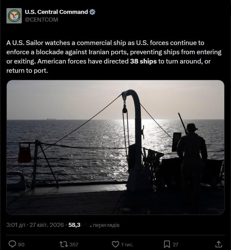 美国继续对伊朗港口实施封锁,不允许船只进出港口。美国军方已命令38艘船只掉头或返回部署港口 — 美国中央司令部(CENTCOM)。