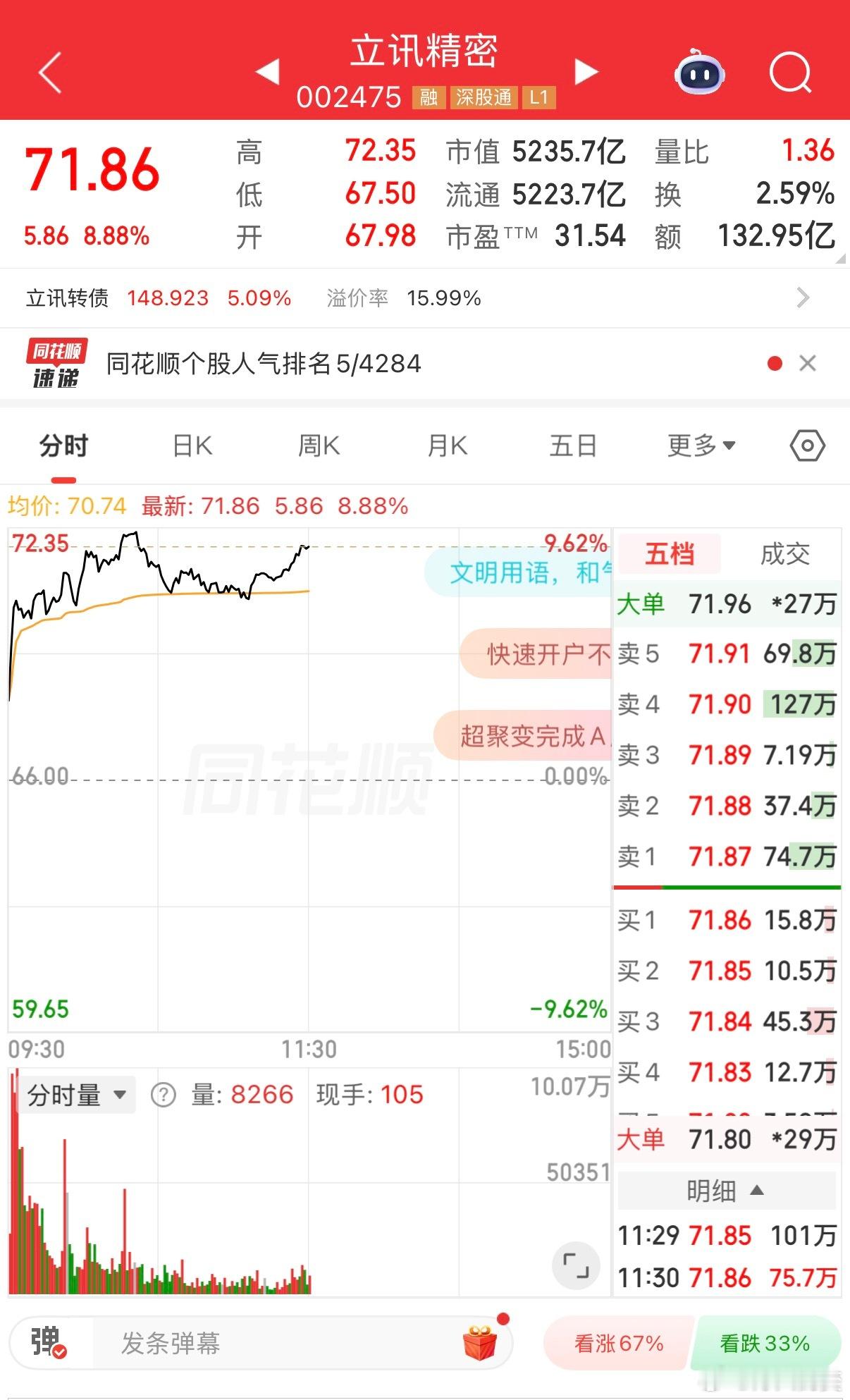 前几年四十几买了立讯精密,放在里边就没管过,今天打开一看,已经71块了。