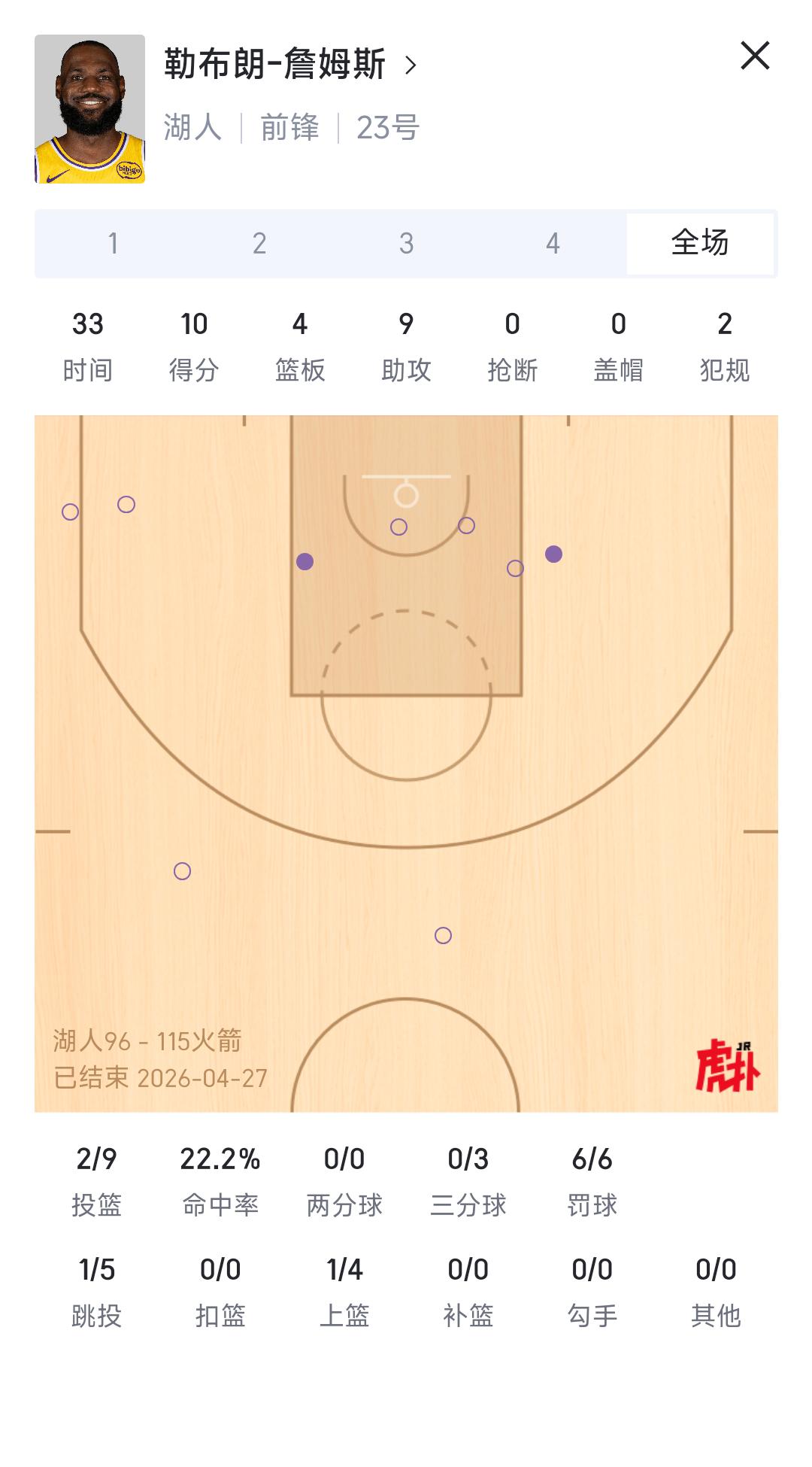 詹姆斯今天9投2中,职业生涯最低谷,差点得分没上双。 后面比赛老詹必须努力,否则第二轮就是终点。 对面申京,谢泼德,阿门汤普森,伊森个个能投,年轻人确实有活力呀。[可怜]
