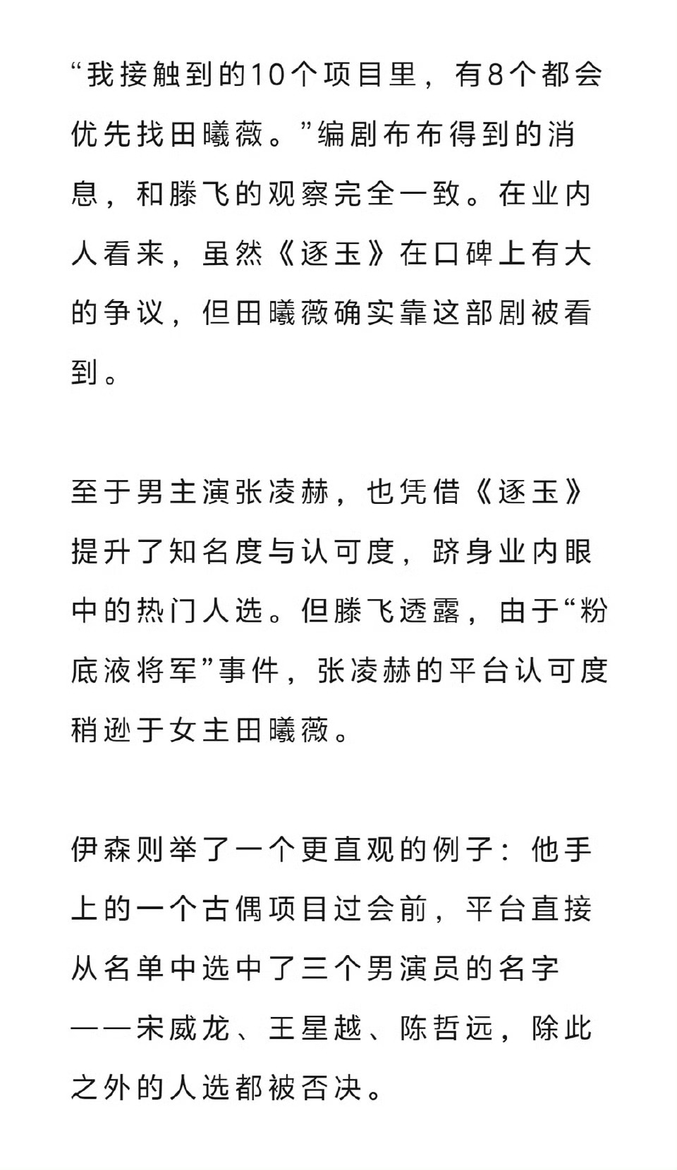 业内腾飞说,逐玉播出之后田曦薇张凌赫的知名度都得到很大幅度的提升。但是张凌赫平台认可度稍逊于田曦薇