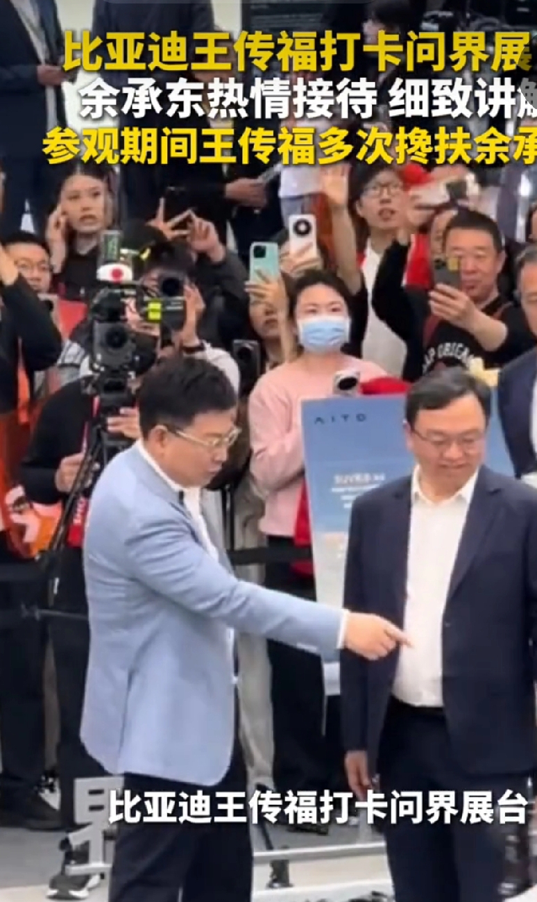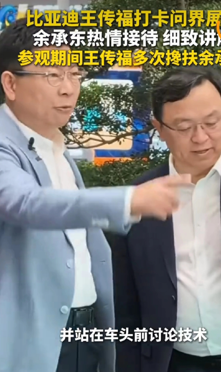 王传福打卡问界展台 余承东亲自讲解,这俩大佬同框简直是北京车展最炸的名场面!以前俩人还为自动驾驶是不是“忽悠”隔空呛过声,这回余大嘴拉着王传福挨个介绍M9的激光雷达、智驾系统,俩人聊得热热闹闹,王传福还不忘特意关心于东海的腿,真的是大佬们私下也这么接地气啊! 不过网友都笑疯了,有人说这是“比亚迪来考察华为智驾做得咋样,不行以后给比亚迪全配上”,还有人说这是强强联合的信号,毕竟王传福认电动化是上半场、余承东说智能化是下半场的观点本来就合拍,真要是两家以后搞点合作,那其他车企还怎么玩? 说真的,以前国产车企都是各自闷头卷,现在大佬们都愿意凑一块交流技术,这不比打嘴仗强多了?咱国产车企拧成一股绳,还愁卷不过那些合资豪华品牌?
