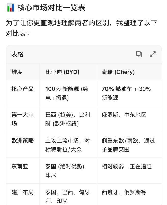 尹同跃在北京车展上向王传福承认,比亚迪目前海外销量已经超过了奇瑞,看来俄乌战争和美伊战争对奇瑞的压力还是挺大的,上个月奇瑞亏损了14亿。看两个品牌的市场分配就明白,比亚迪的核心市场是比利时、巴西、泰国,奇瑞的主要市场是俄罗斯、中东,刚好也是这几年受到战争影响最大的市场。
