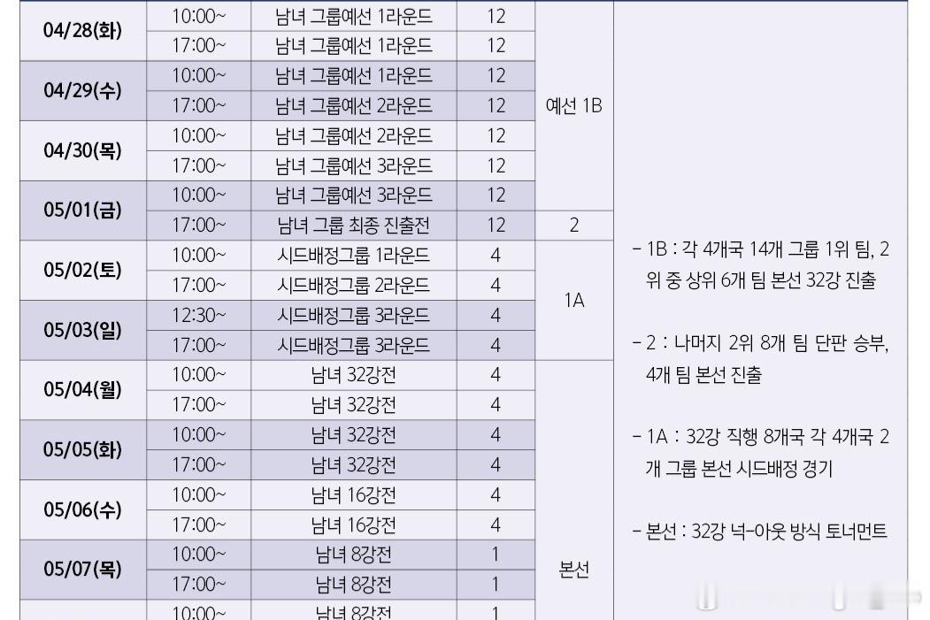 截至4月,韩国男队世界排名第6,女队第3,均从种子组起步。这意味着开局稳定,但也不可避免要早早面对强队。