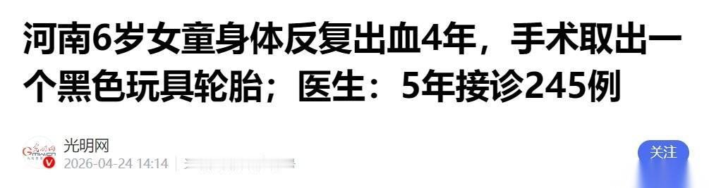 河南郑州,6岁女孩下体一直流血,反反复复在各家医院来回四年,却一直查不出原因。直到最后在一家省医院做深度检查,才终于揪出了真正的祸根——一个硬胶质地的微型玩具车轮。 这事看得人直窝火。 整整熬了一千四百多天,难道真是啥疑难杂症?根本不是。大人们的死板,生生把一个小状况拖成了大噩梦。 带过娃的都知道,两三岁的小孩对什么都好奇,最爱干的事,就是把手里的小玩意往各种窟窿眼儿里塞。一个才两岁的女娃平白无故渗血,但凡家长多留点心,第一时间就该往“是不是藏了异物”上面想。 结果一家人硬是顺着发炎感染的思路,带着孩子到处跑。 医院那头也脱不开干系。 四年时间,换了那么多家大夫,硬是没一个人给安排个专项排查。抛开客观条件不谈,基层大夫心里其实也怵头给这么小的孩子做那种检查。按部就班开点洗液、消炎药,哪怕治标不治本,最起码流程上挑不出错。 没人愿意打破常规多问一句。 也没人敢往深处多探一步。 别总拿“孩子太小不会表达”当借口。这四年里,无论是家长的日常照看,还是前期的接诊,全都败给了麻痹大意和照本宣科。 一个破塑料轮子能在身体里藏这么久,大人们的心得多大。 给娃娃当监护人,就得多点偏执的敏感。多去盘问盘问那些所谓的“不可能”,关键时刻真能少让孩子遭大罪。 对此,你怎么看?