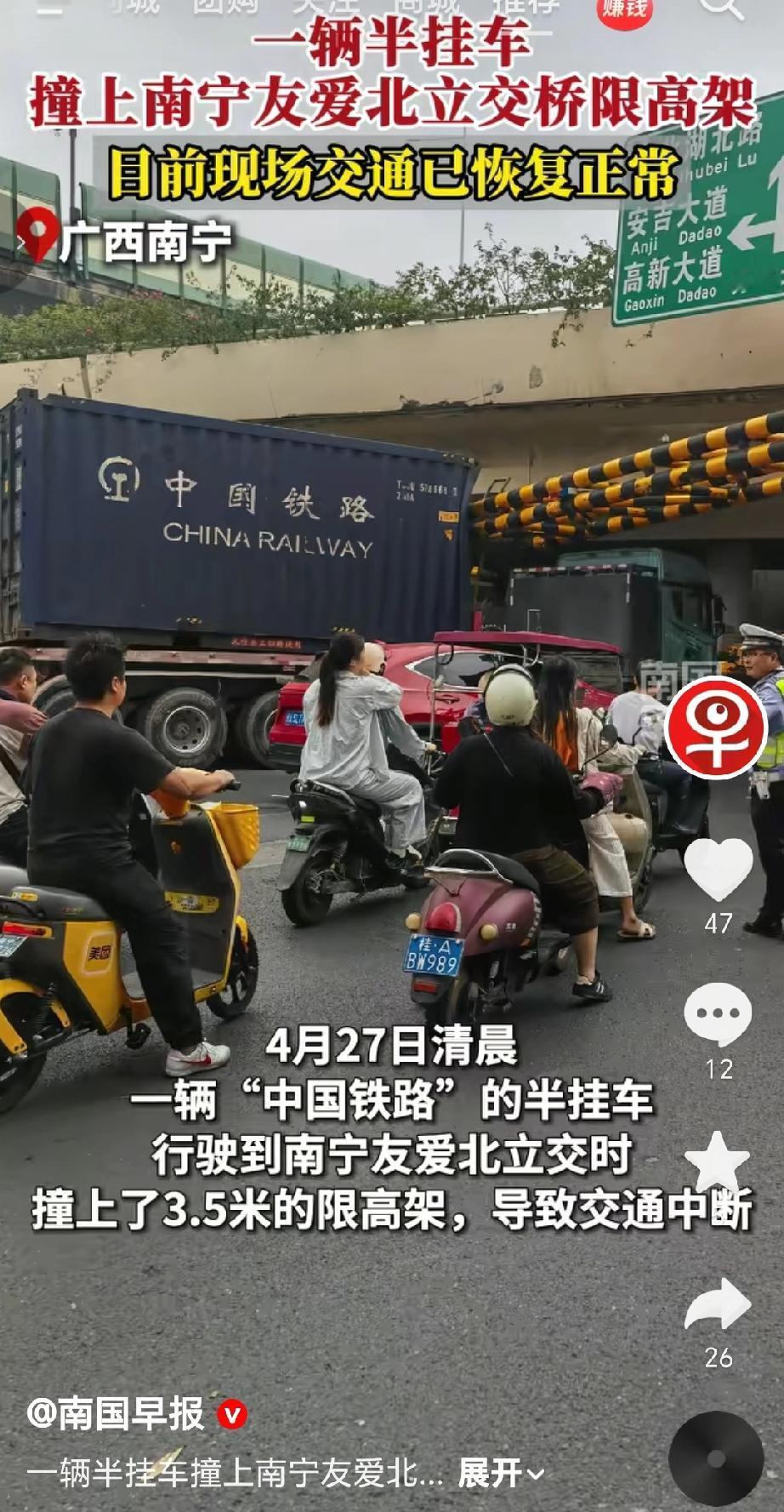 2026年4月27日清晨,一辆半挂车行驶至广西南宁友爱北立交时,撞上了3.5米的限高架,导致交通中断。事发后,南宁城市运营集团有限责任公司于7时发现情况,立即与交警配合采取临时交通管制。上午10时20分,维护人员拆除倒塌的限高架,现场交通秩序逐渐恢复,肇事车辆也已被交警拖移。不过,施工人员拆除限高架受损设备后,后续恢复工作预计还需要一个多月。(来源于@南国早报 )