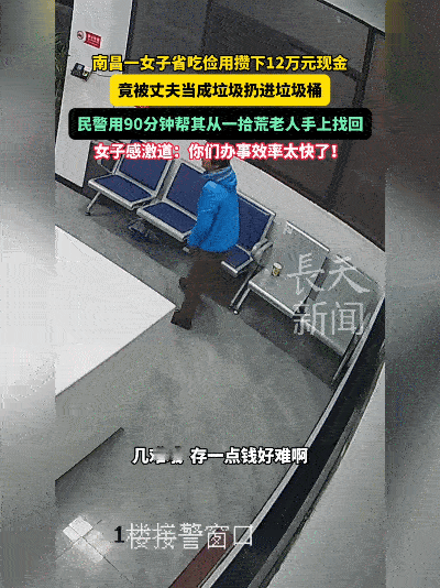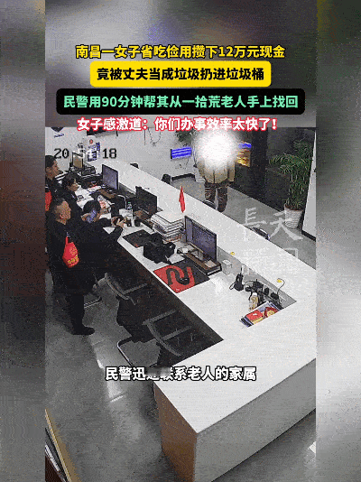 南昌12万救命钱当废纸扔!民警90分钟极速找回,拾荒老人举动太暖! 谁家遇到这事儿都得疯!南昌吕女士最近差点急出病来:她和老伴攒了大半辈子的12万块,那是给儿子娶媳妇、也是给老两口留的看病钱,结果被老伴当成没用的废纸,随手扔进了楼下垃圾桶! 吕女士攥着钥匙的手都在抖,冲进绳金塔派出所时声音都劈了:“警察同志!那钱是我后半辈子的指望啊!”民警二话不说立刻行动,立马调取监控一帧帧仔细排查,很快就锁定关键画面:一位拾荒老人推着三轮车经过垃圾桶时,捡走了装钱的袋子。 民警火速联动社区查找老人信息,没想到老人儿子接到电话时,正吃饭的他直接撂下碗筷往家赶,直言老人捡到装满钱的袋子后,一直琢磨着要上交归还。 从吕女士报警到拿回全部钱款,前后仅仅90分钟!抱着失而复得的12万,吕女士数钱的手不停颤抖,红着眼眶不停道谢,这哪里是钱,分明是一家人后半辈子的踏实和指望! 12万对普通家庭来说,是菜市场讨价还价省下的毛票,是熬夜加班挣来的辛苦钱,是一点点从牙缝里抠出来的积蓄,丢了足以让人急火攻心。 好在民警尽责,把百姓的急事当成头等大事;好在老人拾金不昧,面对横财毫不动心,平凡人身上的善良与担当,才最让人暖心。 为尽职尽责的民警点赞,为拾金不昧的老人致敬! 民警90分钟找回救命钱 拾金不昧最可敬 信息来源:今视频长天新闻。 图片来源:今视频长天新闻,如有侵权,请联系删除。