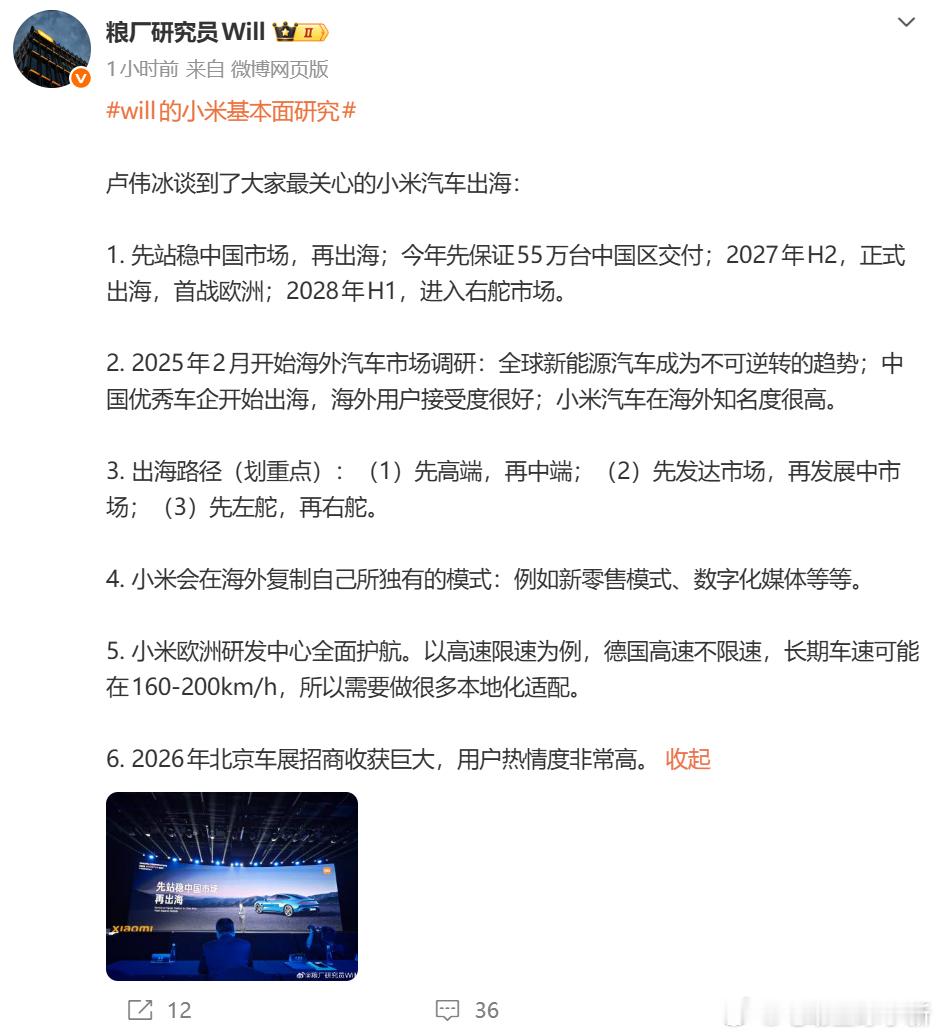 分享在今天的小米投资日上,卢伟冰谈到了小米汽车出海: