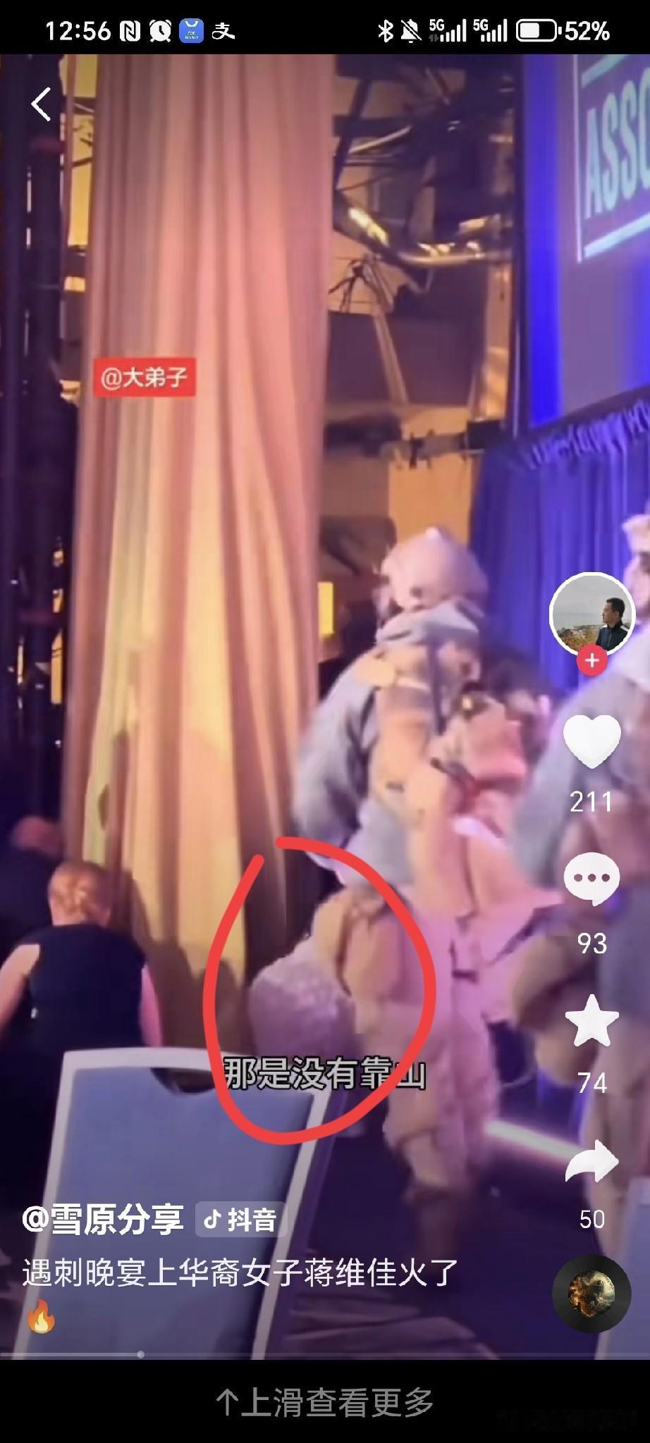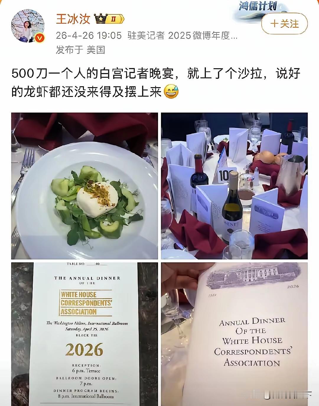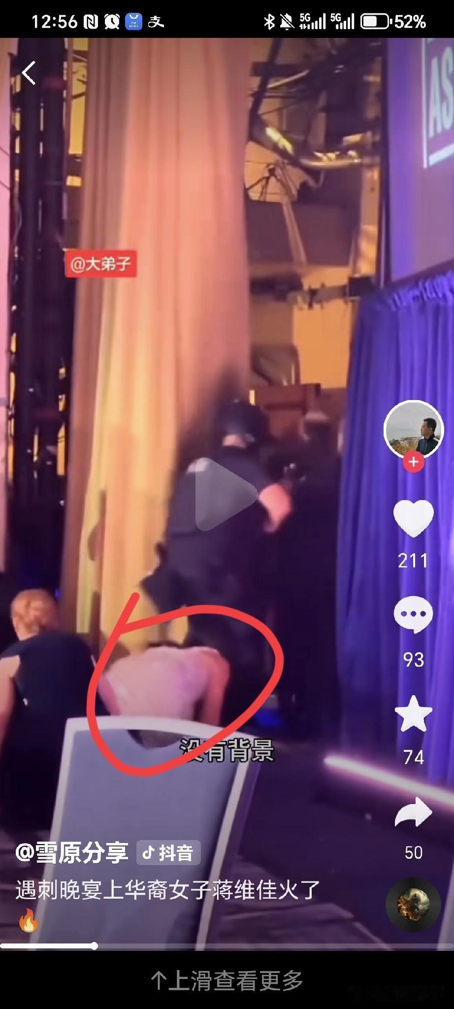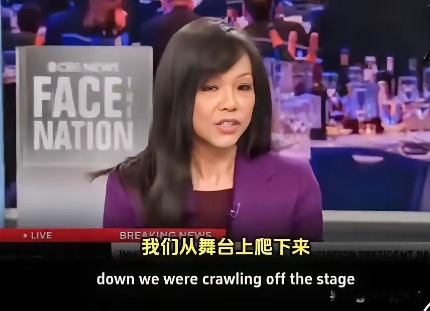 这次这个蒋维佳(Weijia Jiang)可以说是亏大了! 既损失了形象,就她一个人是爬着出去了(看图5只有大腚在房间内了),当然和特朗普有一拼,特朗普是瘫着被拎出去的! 而且还损失了金钱,这个白宫的记者晚宴竟然是五百美元一位,必须承认特朗普商人出身就是会算计。 而且这次所有钱全给省下来了,龙虾,鲍鱼等大餐都没有上,每个人只喝了点白开水,你说这能有什么开销呢? 有好事者问:特朗普,你们能退费吗?如果不退,下次参加能不能免费或者打点折呢? 回答:退费不可能,下次打骨折可能! 饶是如此,这个蒋维佳事后采访时竟然这样说(图7-8),这次安保做的很好!这些特勤人员非常专业!不是她要爬出去的,是这些特勤人员让她爬出去的,她还真听话啊! 怎么就没有人把她像拎特朗普一样拎出去呢?