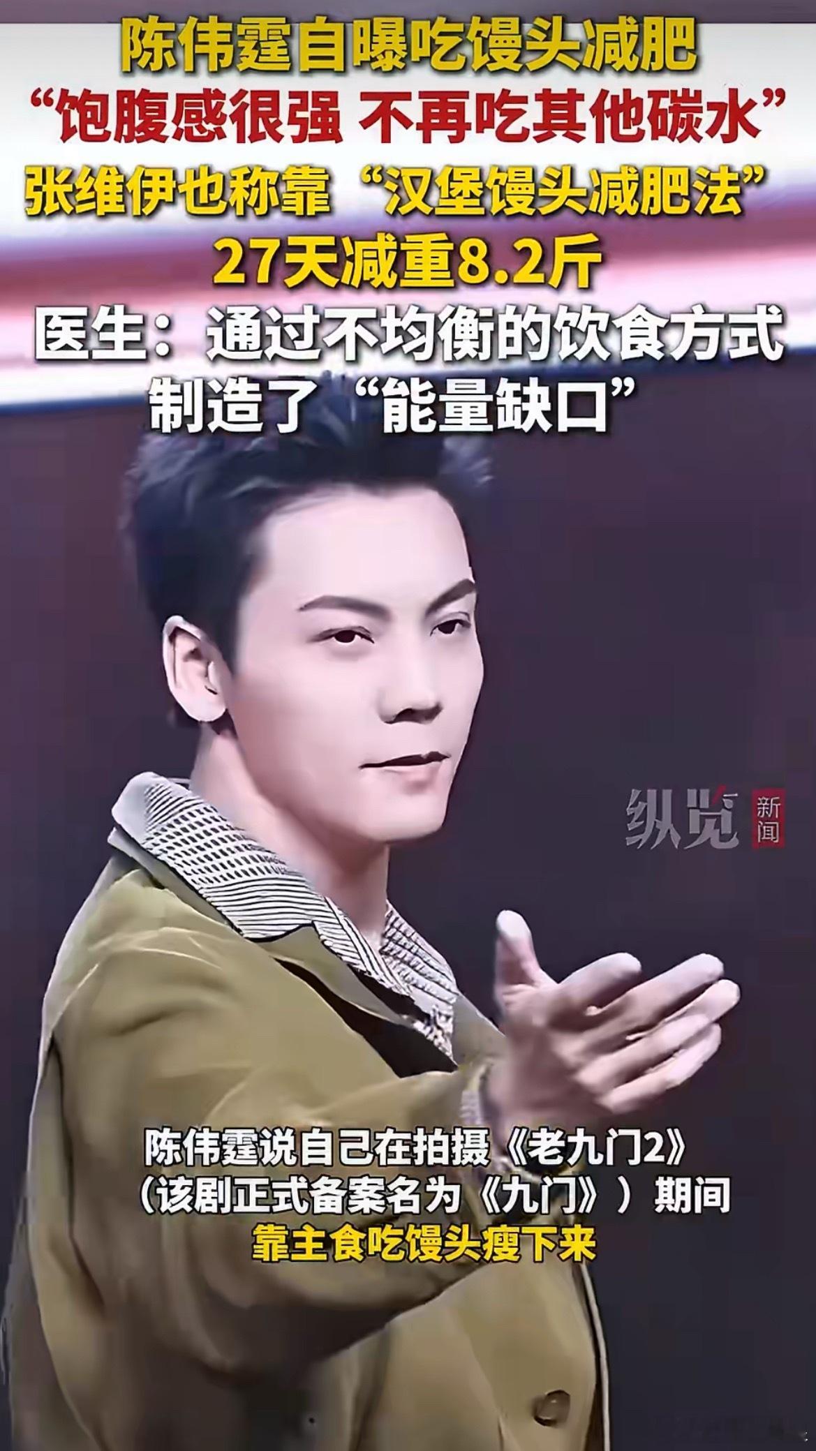陈伟霆分享吃馒头减重经验演员陈伟霆自曝在拍摄《老九门2》期间,靠吃馒头减重20斤。他表示,馒头的饱腹感很强,吃了馒头后就不会再吃其他的碳水。