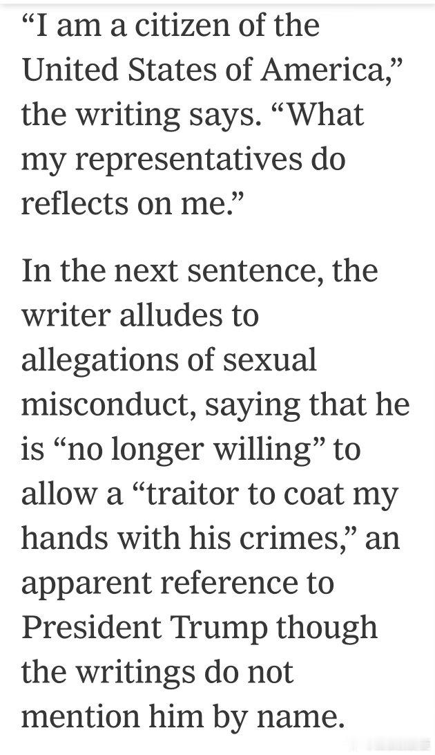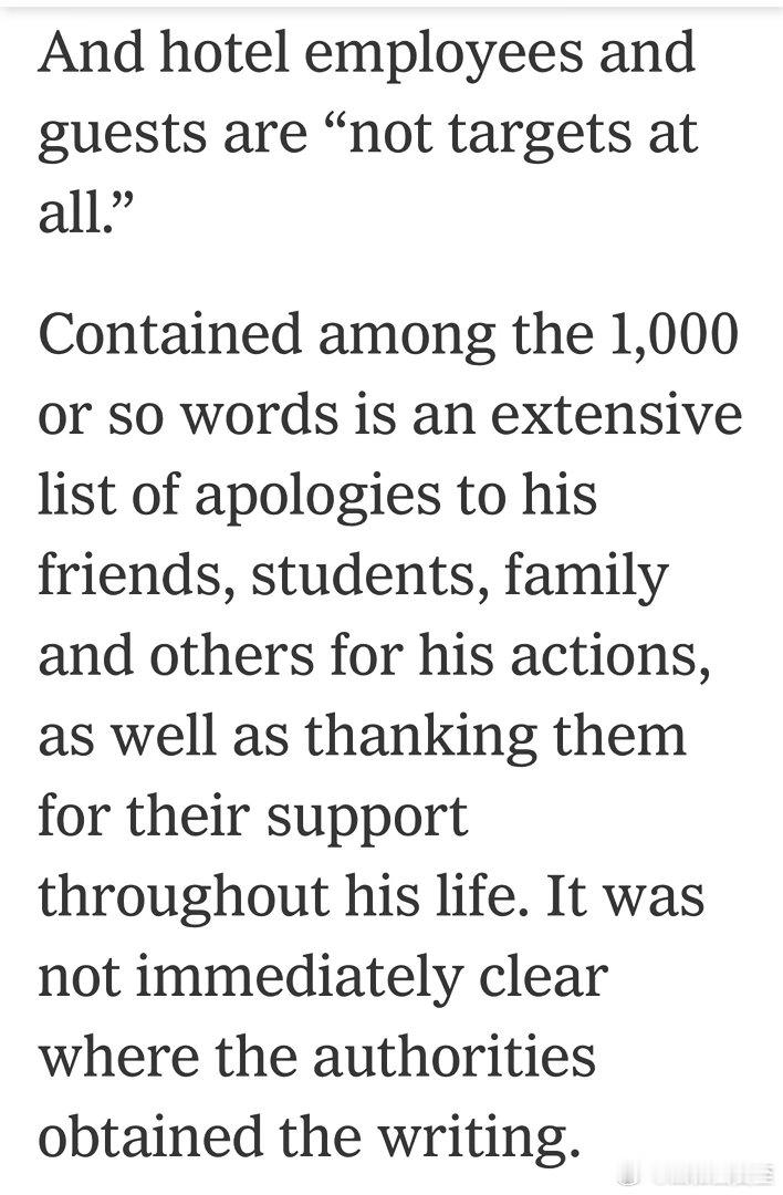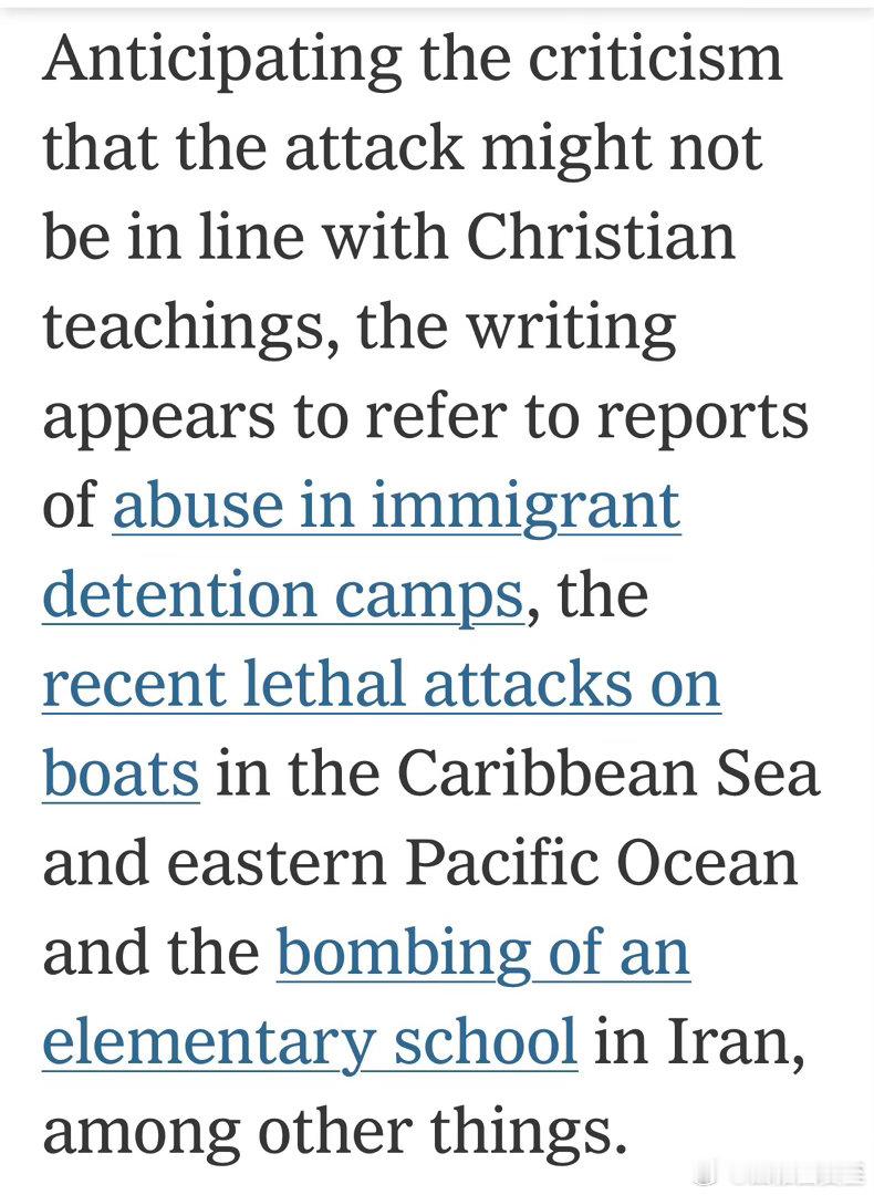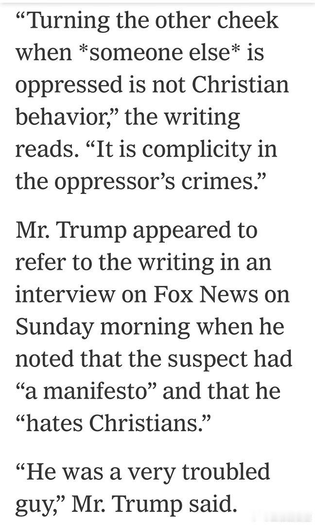 针对预期的“不符合基督教教义”指责,枪手列举了本届政府治下,移民执法在关押所滥用职权、美军在加勒比和太平洋袭击渔船、在伊朗轰炸小学等行为…并表示:他人受压迫时置若罔闻,不是基督徒的行为,而是压迫者犯罪的帮凶…