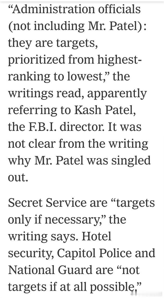 媒体得到枪手事前写好的“宣言”:我是美国公民,民选官员的言行要体现我的价值观…总统有性侵行为,我不能再让他的罪沾满我的手…这届官员,自上而下,都是我的目标(FBI局长除外)…特勤人员,必要时才是目标;酒店保安、国会警察、国民卫队,尽可能不作为目标;酒店员工和客人,完全不是目标…