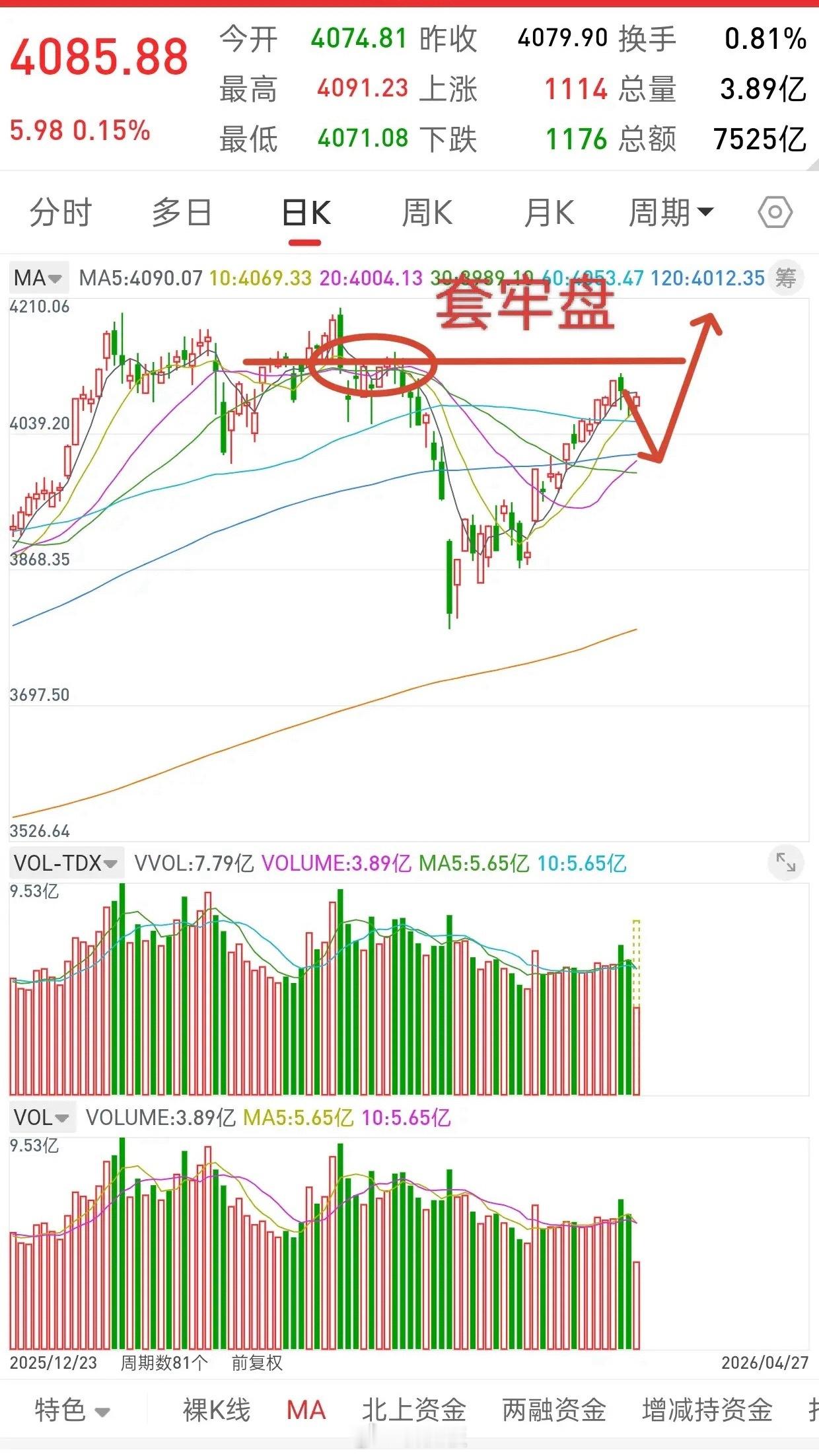 其实当前大盘的走势很清晰,往上有套牢盘密集区,大概4100附近,这里几乎不可能一次突破,上周四的放量下跌,且跌破五日线,上周五缩量十字星,在5-10日均线运行,今天截止中午收盘,小阳线。