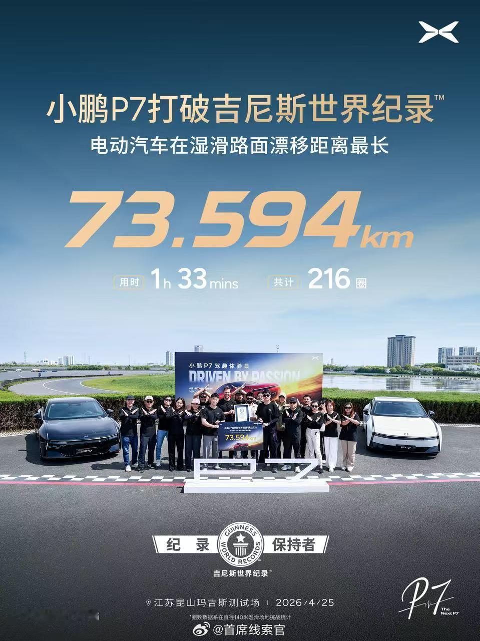 而今天,小鹏 P7 用 1 小时 33 分钟,216 圈,73.594 公里连续漂移再创纪录,成功挑战吉尼斯世界纪录「电动汽车在湿滑路面漂移距离最长」!