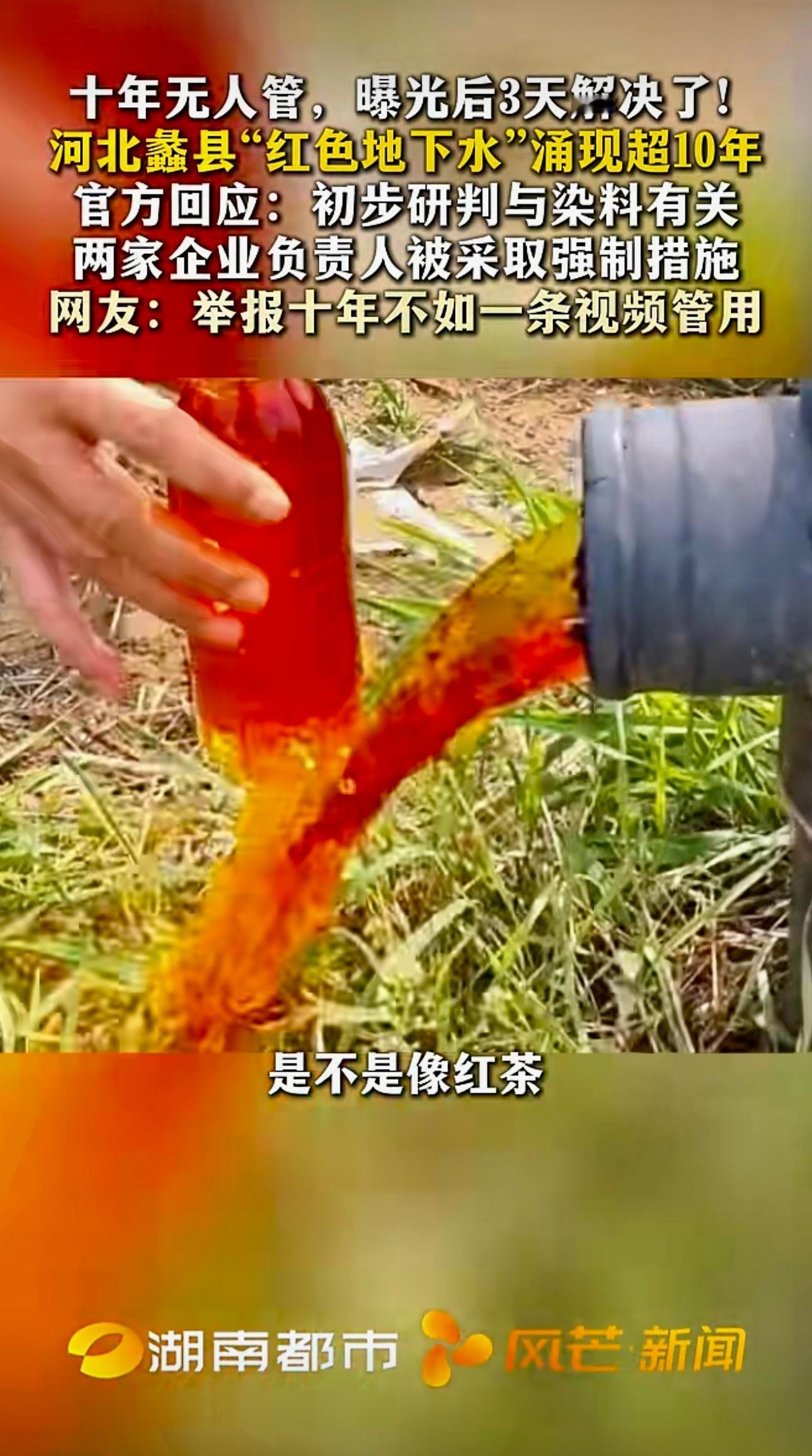 十年无人管,曝光后3天解决了!河北蠡县“红色地下水”涌现超10年,官方回应:初步研判与染料有关 两家企业负责人被采取强制措施 。网友:举报十年不如一条视频管用!