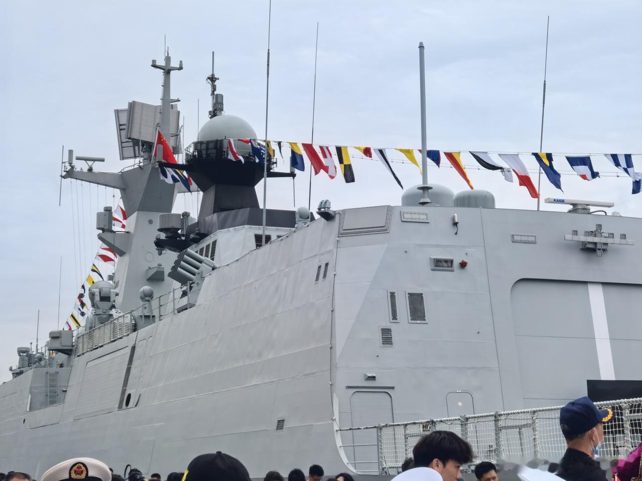054A型539“芜湖”舰机库上方的电子设备: 🔴MR-90火控雷达:海红旗-16防空导弹制导雷达,提供末端目标持续照射; 🔴724 直升机导航雷达:为舰载直升机提供进近引导、着舰导航、空中姿态引导; 🔴SNIT-240A宽带战略卫通:战略级卫星通讯、大容量加密作战数据、高清视频高速传输,带宽与通信优先级为最高; 🔴战术卫通数据链复合天线(疑似):战术级备份卫通+编队数据链一体化设备,主打强抗干扰编队协同、战术保密冗余通信; 🔴战术卫星通信天线:小型备用卫通终端,承担勤务联络近岸与编队基础备份卫星通信任务; 🔴HF短波天线:超远距离通信,尤其适用于无法依赖卫星或视距通信的场景; 🔴红外光电探头:全天候被动光学/红外探测设备,静默搜索低空目标、海面小型目标、来袭导弹; 🔴激光告警接收机:被动接收敌方激光测距、激光火控照射信号,一旦被敌方瞄准锁定即可立刻告警并处罚电子干扰与防御,与H/RJZ-726综合电子战系统的一部分,与干扰器和有源干扰发射机联动。 那个战术卫通数据链复合天线是推测,早期054A中并没有这个装置,而且在052D部分型号中也有。 图2是大佬(见水印)拍摄的最新批次的054A型519“阜阳”舰,直接在舰体内集成了海红旗-16的有源相控阵的火控雷达,整合了新型卫通,所以机库上方已经非常简洁了,没有那么多杂乱的天线。 详细介绍一下战术卫星通信天线