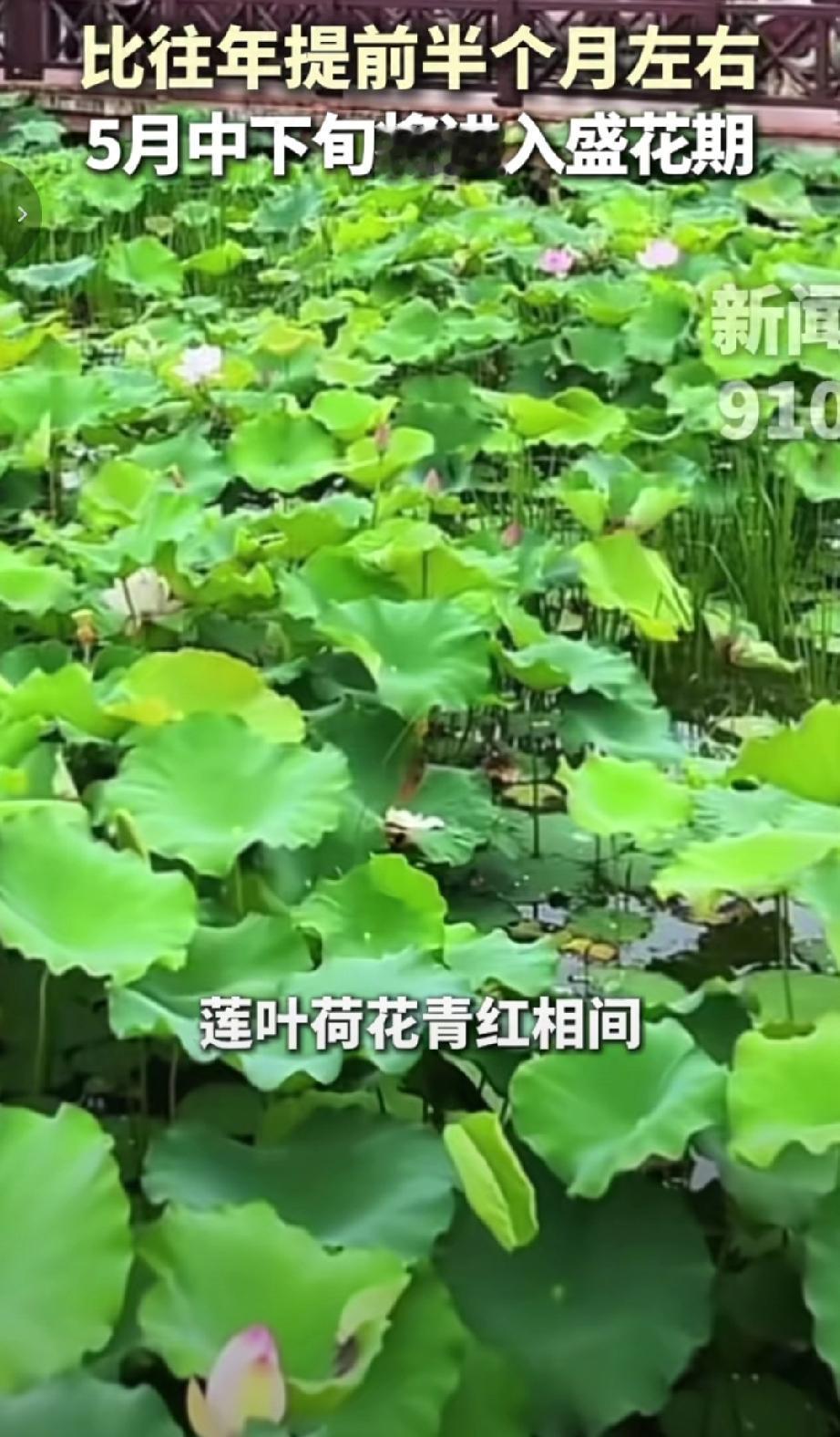 近日南宁南湖公园的荷花比往年提前半个月左右提前绽放,吸引了不少市民前来观赏。往年荷花一般在5月中旬进入花期并持续到8月,今年因气候温暖,还没到5月就已悄然开放。在南湖公园九曲桥荷花池,近2000株荷花盛开,荷塘碧波荡漾,莲叶荷花青红相间,呈现出一派生机盎然的景象。有的花苞从荷叶下探出粉红“脑袋”,显得俏丽多姿;有的则亭亭玉立,盛放在碧绿的荷叶之间,在绿叶碧波间勾勒出“接天莲叶无穷碧”的诗意画卷。目前九曲桥荷花池率先盛开的多为粉色荷花,预计5月中下旬将进入盛花期,即将成为新的打卡地。(来源于@广西台新闻910)
