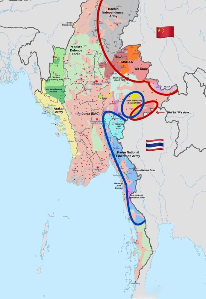 缅甸是否正在逐渐裂开? 蓝色区域目前主要流通泰铢,红色区域主要用人民币,这其实真不是啥最近才冒出来的新鲜事。缅北还有泰缅边境这些地方,缅甸中央政府管不到的年头太久了,各支地方武装各占各的地盘,两边的边民常年互相串亲戚、做小生意,怎么生活方便怎么来,慢慢就形成了用邻国货币、说邻国语言的习惯,都是常年往来自然形成的状态。 至于泰缅边境那片红蓝重叠的区域确实得多留心,各方势力盘根错节搅在一起,利益诉求也各不相同,真要是哪天利益谈不拢很容易擦枪走火。咱们平时多关注官方的通报就行,没事千万别往局势不明的边境区域乱跑,平平安安比啥都重要。