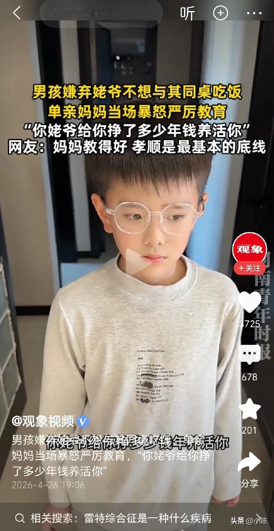 这妈妈三观正!黑龙江,男孩嫌弃姥爷,不想和姥爷同桌吃饭,妈妈可不惯着,当场暴怒严厉教育,只用一句话就让孩子语塞:“你姥爷挣了多少年钱养活你?你心里没数吗?现在你长大了,你整这出,这是人应该干的事儿吗?” 网友评论:这妈妈教的好,孝顺是做人最基本的底线,如果孝顺都没了,那就支撑不起一撇一捺的“人”! 女子和老公离异后就搬回了娘家,这些年也是一直靠着父母的资助才把儿子养这么大,如今儿子竟然嫌弃自己的姥爷,女子实在看不下去! 她直接揪着儿子的衣领,把他拉到旁边教训,女子问儿子:你是不是不想让你姥爷吃饭? 儿子摇摇头,说:不是的! 女子又问:和姥爷一起吃饭,你是不是嫌弃他了? 儿子沉默片刻,小心翼翼的说:有一点! 女子又问:你姥爷,他是我什么人? 儿子回答:他是你爸爸! 女子又问:你姥爷挣了多少年钱养活你?现在你有能力了,你长大了,你给我整这出,这是人能做出来的事儿吗? 儿子默默低下了头,心里愧疚万分! 我们常说“老吾老以及人之老”,人自从生下来就是在慢慢变老,这是任何人都无法逃避的事实! 人老了以后,会有很多很多的毛病,比如吃饭的时候嚼的特别慢,身上会有一股老人味儿,可能嘴巴还会漏饭菜,剩菜热了一顿又一顿等… 那又能怎么样?难道就因为这些,我们就嫌弃老人吗?那样对老人是不是太不公平了,毕竟我们也有会老的那一天的! 这位单亲妈妈给我们树立了一个正能量的榜样,在儿子的思想观念出现偏差的时候,第一时间纠正回来! 孩子是不懂事的,他们生下来就是一张白纸,这张白纸上面以后要画什么,怎么画,全凭大人说了算! 因此,大人的三观决定了孩子的未来,尤其作为孩子的父母,他们是孩子的第一个榜样,他们的一言一行但会影响孩子一生! 我们爱孩子,但是不能惯孩子,该有的规矩从小就要树立,一旦错过了那个年纪,想再回头可就难了!