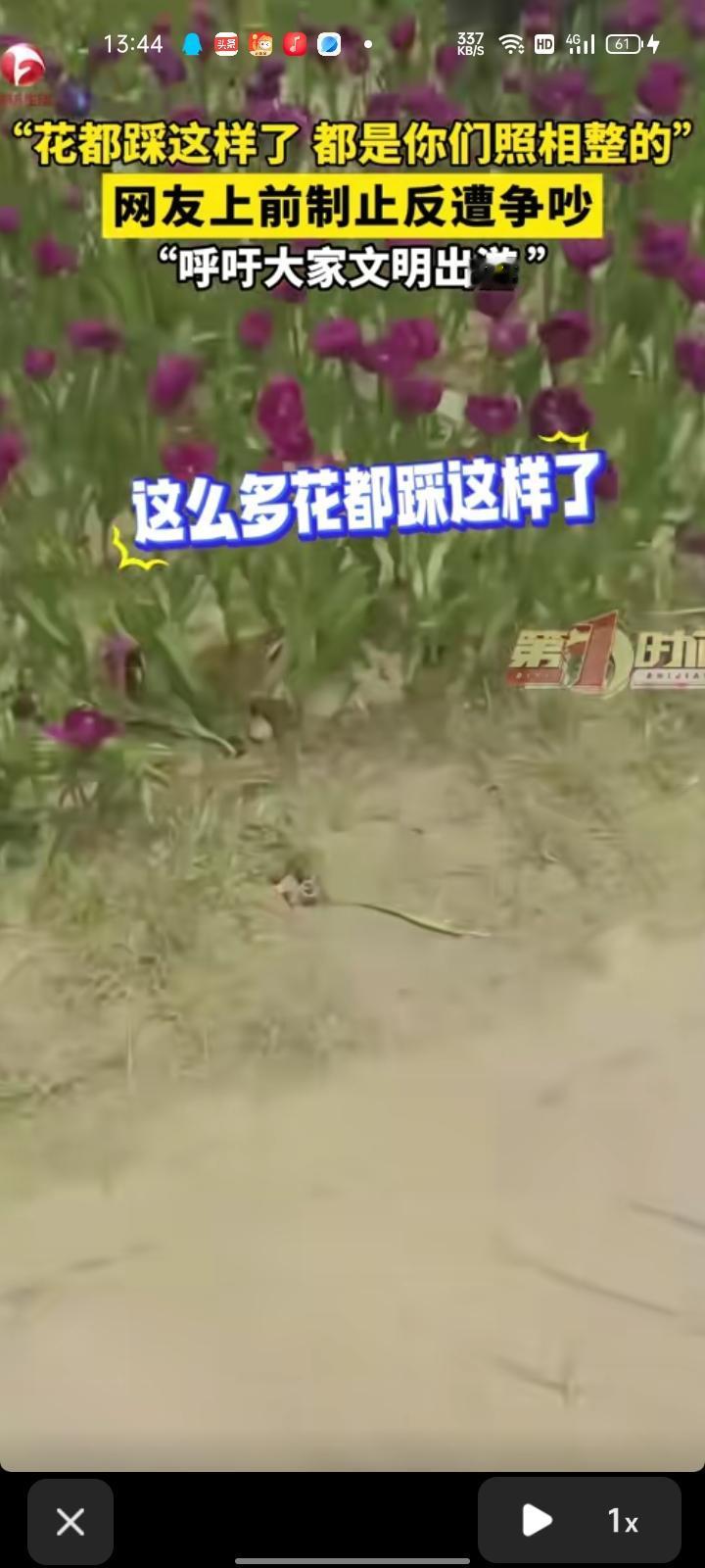 4月23日,新疆乌鲁木齐。网友发视频称,郁金香节之际,两个年轻人站在花丛中拍照,把花都踩坏了,想上前制止,结果对方不仅不听劝,还吵了起来。好好的花是用来欣赏的,不是用来踩的,呼吁大家文明出游
