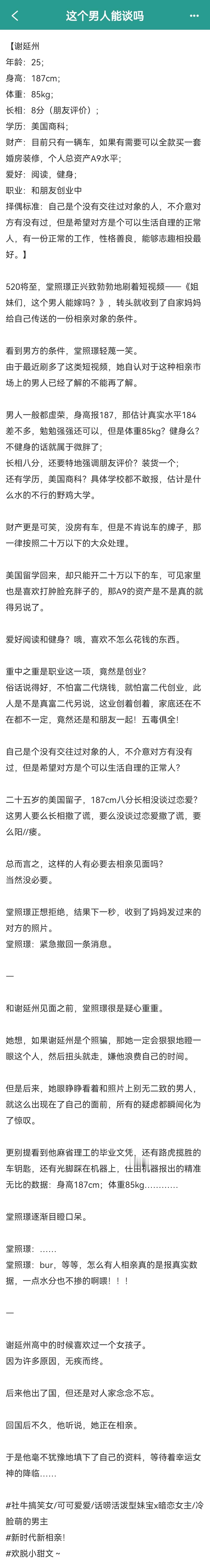 《这个男人能谈吗》作者:东风已完结 社牛搞笑女/话痨活泼型妹宝X暗恋女主/冷脸萌男主,男主视角暗恋成真我愿称之为这篇文是立足于当今社会背景,扎根于现实的产物哈哈哈哈,严重怀疑作者是不是看了很多分析相亲对象的视频,不然这么会这么抽象又真实。男主在高中对女主惊鸿一瞥后就默默关注女主并且开始了自己独角戏的暗恋,喜欢女主真的一点都不奇怪。女主长的漂亮,父母宠爱着长大,性格爽朗大方有趣,像个小太阳一样,我是男主我也暗恋...不过女主也是究极颜控的人,除了高考毕业后为了避开狂蜂浪蝶假装和别人谈恋爱外,女主其实毫无经验。男主和女主相亲是男主看到了堂哥的相亲资料是女主的,然后用自己的信息把堂哥的资料调换了,然后堂而皇之地登场和女主相亲。女主也是看到了男主的脸见色起意愿意前往相亲,见面后发现男主的条件确实非常优秀,于是和姐妹团们开始怀疑男主这样的条件为什么还要相亲。所以前期在男主的视角是终于和女神邮件交集,而且是正儿八经地相亲可以有正当理由相处了,在女主的视角就是越相处越满意同时怀疑天上掉馅饼这里面不会有什么坑吧。不过日久见人心,男主对自己的用心和爱意让女主选择相信他,两人在确认关系后女主最后也发现男主暗恋自己很久的事情,于是两个人更是坦诚相处了,顺利订婚结婚。很日常但是又有点搞笑的小甜文,可以冲!