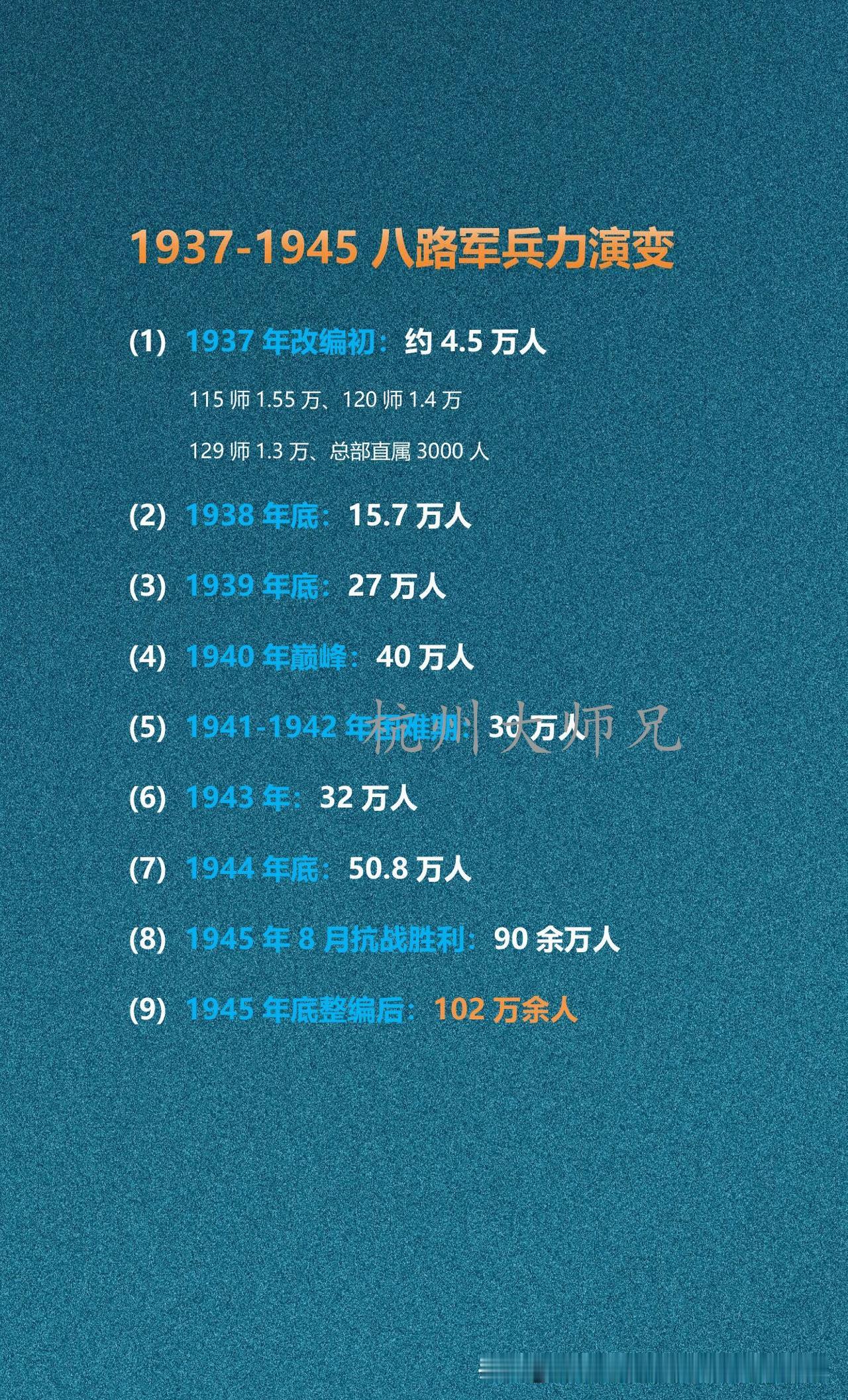 1937-1945八路军兵力演变 1937年,全面抗战开始,八路军从改编初期的4.5万人,到抗战胜利时的90余万,再到年底整编后的102万人,八路军在艰苦卓绝的敌后作战中不断发展。经历1940年40万人的巅峰,也度过1941-1942年30万人的困难期,最终成为一支战无不胜的百万雄师。