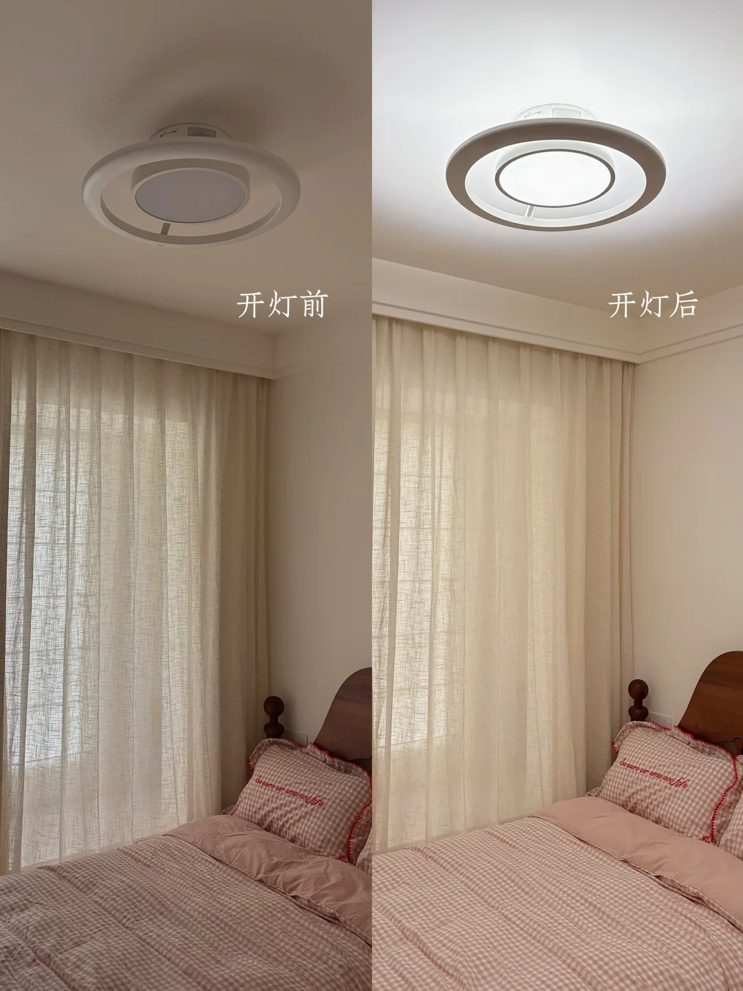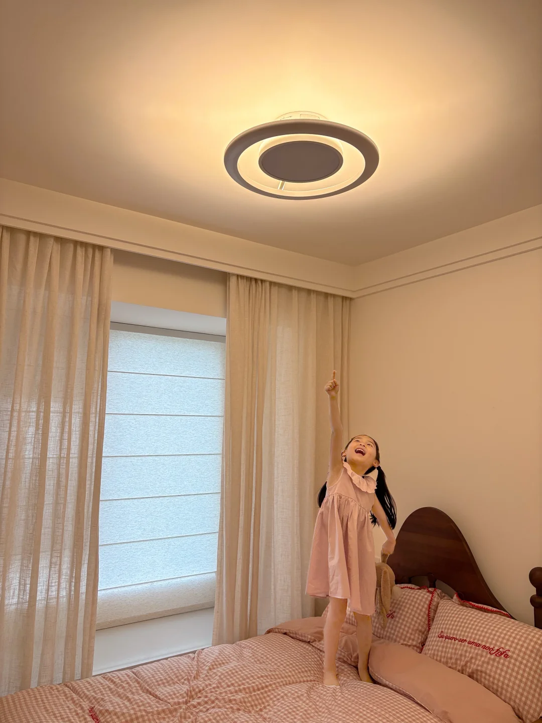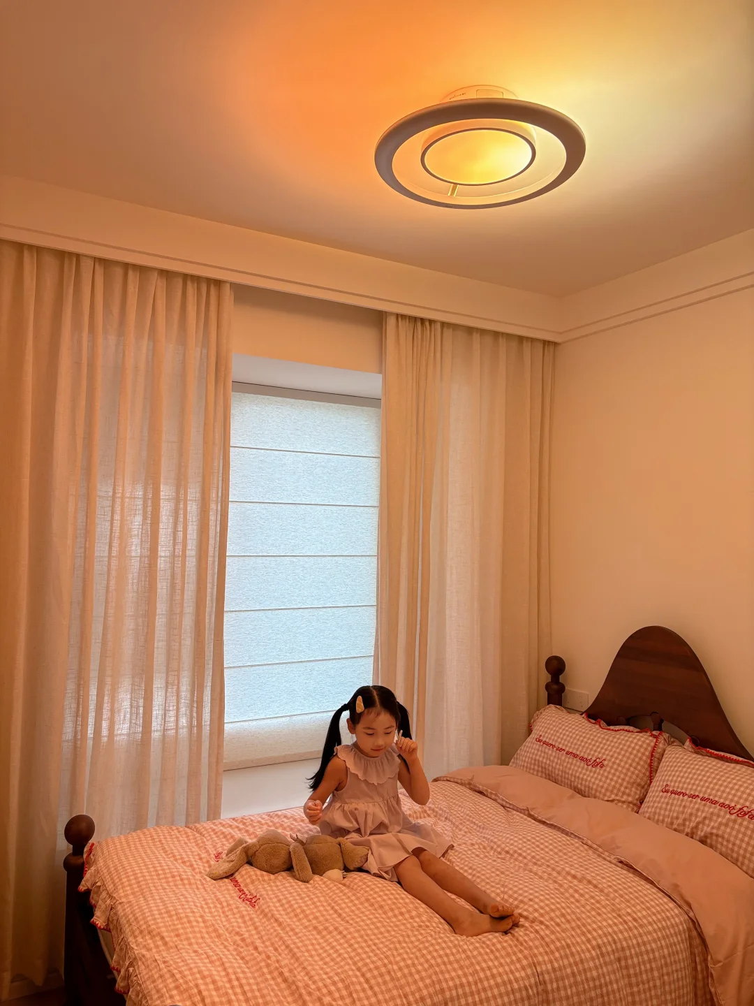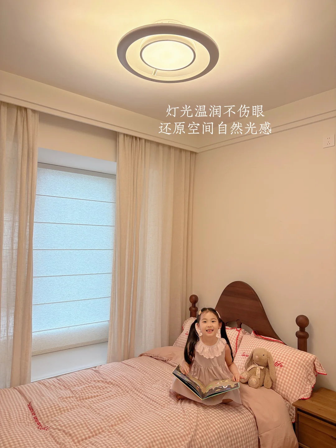 我家这个不大的儿童房,硬装就是简简单单的奶油风底子,软乎乎的粉格子床品+温柔亚麻纱帘,看着干净又治愈,但总觉得少了点让孩子安心的温度。