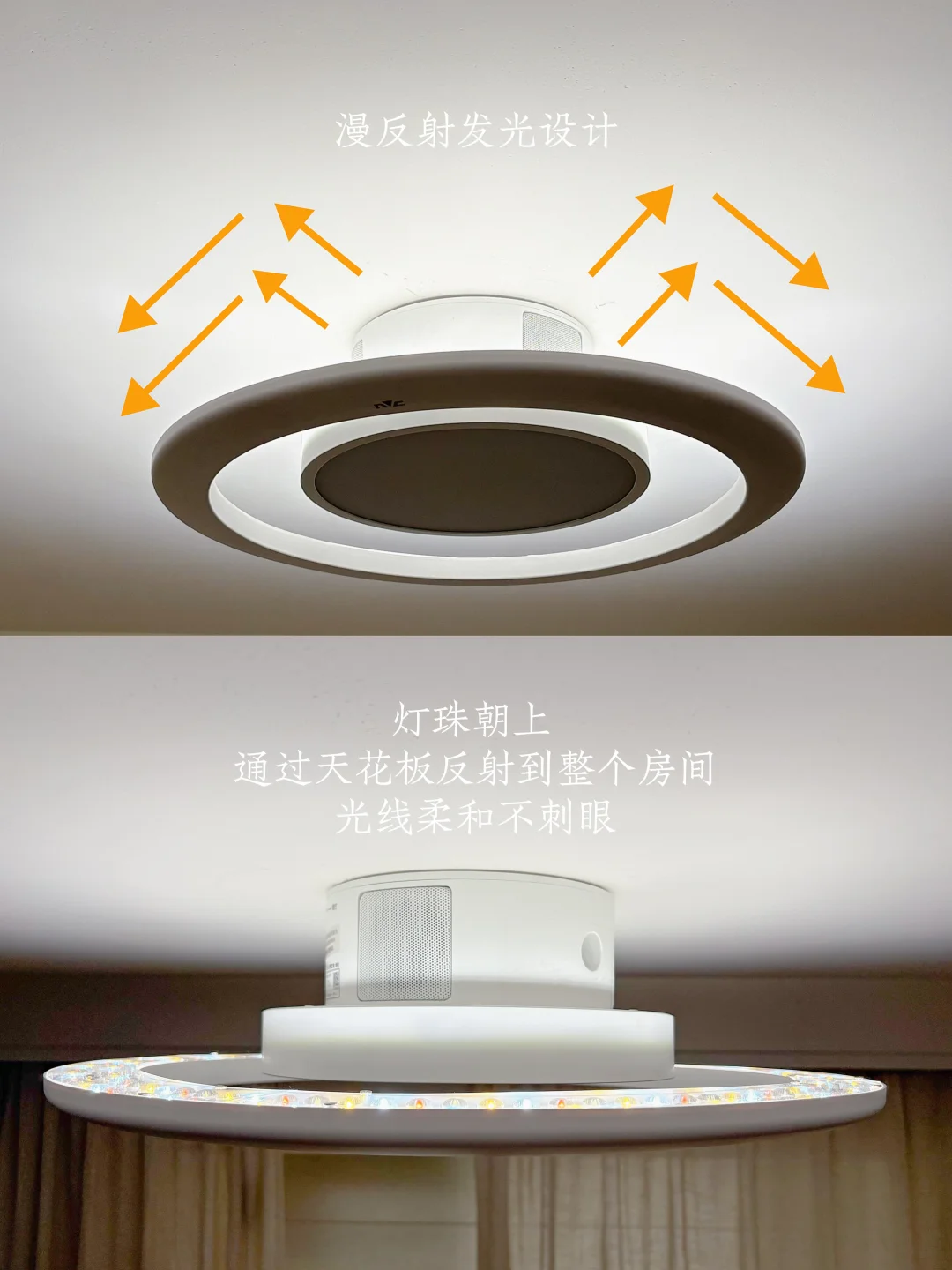 我家装的雷士未来光Ultra天籁,它的灯珠是朝上的漫反射设计,光线先打到天花板再漫散射下来,一点都不直射晃眼,完全没有刺眼眩光。