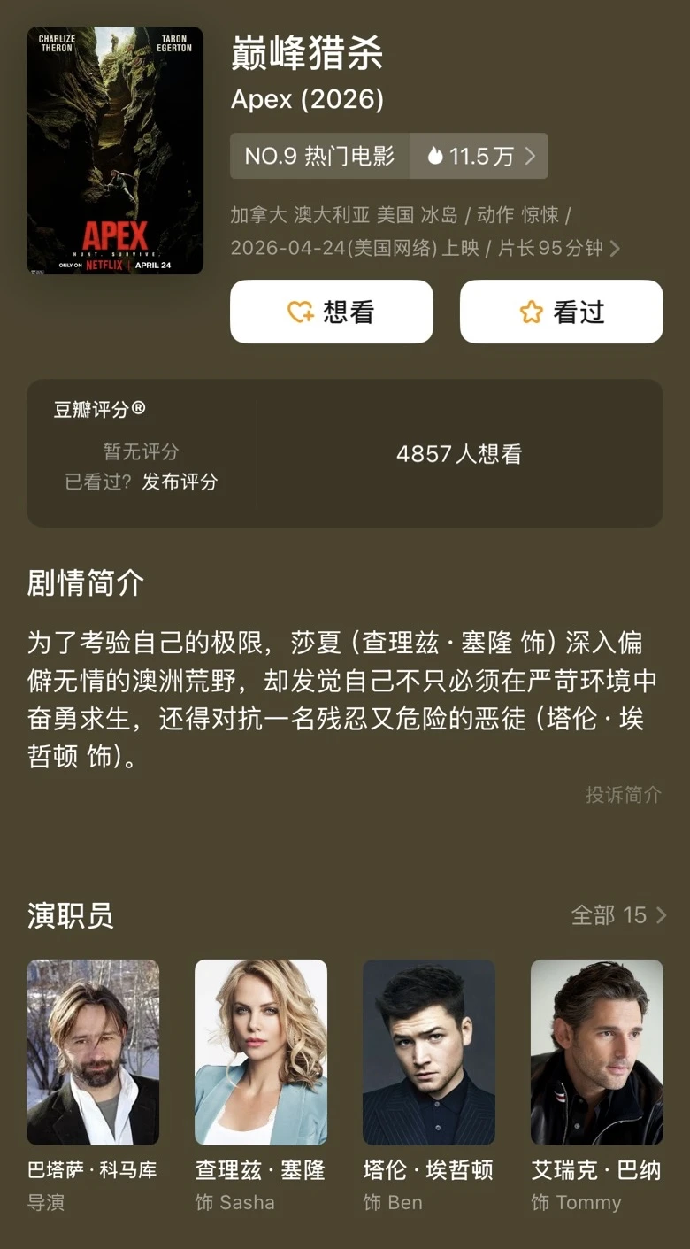 查理兹・塞隆全新力作《APEX》上线 昨晚(4.24)第一时间看了 本以为是治愈氛围感户外大片 山野露营、绝壁攀岩、激流漂流 绝美荒野风光,氛围感直接拉满 谁料剧情极速反转,唯美户外外壳之下,暗藏惊险杀机,瞬间沦为双人绝境猎杀游戏,全程紧张感拉满,悬念层层交织。 不愧是气场全开的“塞皇” 悬崖峭壁硬核露营,激流险滩破浪前行,绝壁攀岩直面险境,上山下水,极限突围,身手利落,野性十足,全程飒爽爆表,诠释极致酷感。 荒野绝境,生死博弈,“塞皇”本色出演! 颜值与实力双在线,全程高能,越看越上头。
