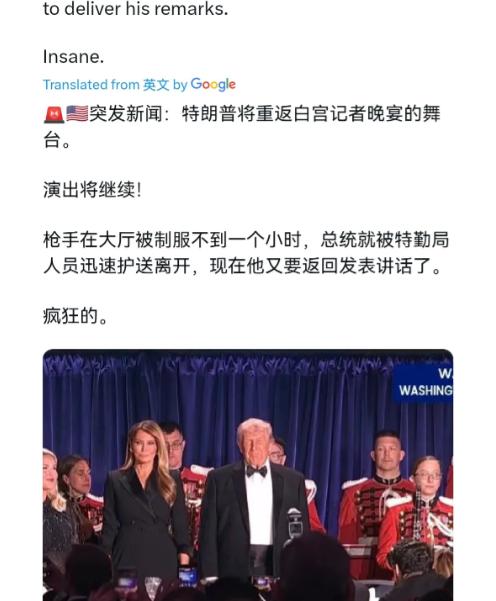 不得不说,特朗普是真爷们!在枪手刚被击毙之后,特朗普在白宫记者晚宴上重返舞台,并做出宣布,演出会继续!外媒表示,不到一个小时,一名枪手在大厅中被制服,特朗普决定返回宴会,并回去发表他的讲话。按理说,刚发生枪击事件,现场人心惶惶、惊魂未定,绝大多数政客都会选择紧急终止活动、立刻离场避险,优先保障自身安全。 特朗普是美国政坛里少有的,真正敢直面暴力威胁、不向恐惧低头的狠角色,这种特质在如今遍地都是精致利己主义者的华盛顿,显得格格不入,却又格外有冲击力。 就在两年前的宾州竞选集会上,他遭遇实打实的刺杀,子弹擦着耳朵飞过当场见血,可他被安保按倒之后,第一反应不是慌着撤离,是起身对着台下的支持者高举拳头,喊出“继续战斗”的口号,事后仅仅几天就重返事发地,再一次开起了竞选集会,丝毫没被枪击事件吓退半步。 华盛顿的主流政客们,面对这类安全事件,早就形成了一套固定的避险流程。枪响的第一时间,立刻被安保簇拥着撤离现场,躲进最高级别的安全屋,当场终止所有活动,后续的行程也会全部取消,然后通过社交媒体发一份不痛不痒的声明,谴责一下暴力事件,全程连面都不会再露。 这套流程的核心,永远是政客自身的绝对安全,至于现场的民众、既定的活动、传递出来的态度,全都可以往后放。这就是华盛顿政客最真实的底色,永远把自己的安危放在所有责任的前面,没有半分担当可言。 这次晚宴事发时,特朗普的反应更是直接戳破了这些政客的伪装。 枪声响起的瞬间,他没有第一时间慌不择路地跑,反而想先看清楚现场到底发生了什么,甚至一度没有配合特勤局的快速撤离要求,这份定力,不是一般政客能有的。 等确认枪手被完全控制,现场没有进一步的威胁之后,他做的第一件事不是继续躲在安全地带,是立刻要求重返晚宴现场。 他心里比谁都清楚,这个时候他站回去,比躲起来发一百份声明都有用,既能给现场惊魂未定的宾客吃下一颗定心丸,更能向全美传递一个最明确的信号,不会因为一次暴力袭击,就停下既定的脚步,更不会向暴力低头。 现在的美国,政治暴力愈演愈烈,从竞选集会到官方晚宴,枪击威胁早就成了政坛的常态,可政客们永远都是嘴上喊着反对暴力,行动上却永远先想着自保,没有一个人敢站出来,用实际行动对抗这份恐惧。 特朗普的做法,直接把这些政客的遮羞布撕得粉碎,他用最直白的行动告诉所有人,什么叫一个领袖该有的样子。 领袖从来不是躲在层层安保后面,对着镜头念稿子的人,是危险刚过,就敢站回舞台中央,告诉所有人“演出继续”的人。 从参选总统到现在,特朗普遭遇的刺杀威胁和安全事件,两只手都数不过来,可每一次,他都没有半分退缩,反而越挫越勇,这也是他能牢牢抓住支持者的核心原因。 美国民众早就看腻了华盛顿那些懦弱、虚伪、只会明哲保身的政客,他们想要的,是一个遇到事不怂、敢站在前面、有血有肉的爷们。哪怕这个人争议满身,可在直面枪口的时候,他比绝大多数政客都有骨气。 一句“演出会继续”,说的从来不只是一场白宫记者晚宴,更是他一以贯之的政治态度,也是无数美国民众心里,那份不向暴力低头、不被恐惧裹挟的底气。不管你喜不喜欢特朗普,都不得不承认,在直面生死威胁的这一刻,他的这份担当,足以让华盛顿的绝大多数政客汗颜。 这场晚宴的枪击事件,最终没有成为一场让美国政坛陷入恐慌的闹剧,反而成了特朗普个人特质最鲜活的注脚,也让所有人看清了,华盛顿的政客们,缺的到底是什么。