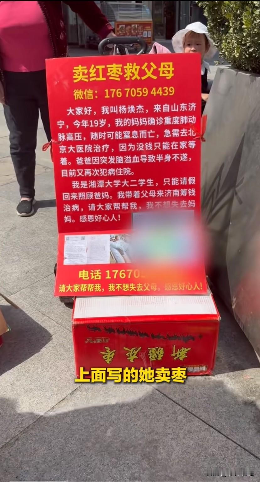 山东济宁,一小姑娘本来在学校好好上学,突然接到家里的消息,母亲病危住进了ICU,父亲本身也有基础病跟着住院,原本就靠低保维持的家一下就塌了。几十万的治疗费用摆在眼前,她一个还没走出校门的学生,根本拿不出这么多钱。 她从湖南赶回山东济南老家,一开始想过卖玩具、卖花筹钱,折腾了几天都没赚多少,后来是当地一家干货店的老板娘孙春华知道了她的事,主动拿了30斤红枣给她,一分钱成本都没要,让她摆摊卖枣凑医药费。 之后她就在街头摆了个小摊子,牌子上写着“卖枣救母”的字样,路过的人知道了她的情况,好多人都特意过来买枣,经常是付了几十上百块,拿两颗枣就走,还有人直接不留姓名给她转捐款。旁边开店的老板娘龚爱芹更是天天给她送饭,大风天还特意给她拿厚衣服,就怕小姑娘冻着。 现在她已经筹到了母亲第一期的治疗费用,她说剩下的这批枣卖完,就专心在医院陪父母治病,之后所有善款的去向她都会公开给大家看,等母亲病好了,她还想回学校把书读完。 我看到这事的时候,第一反应是心酸,第二反应是真的暖。 你说一个20岁左右的小姑娘,本来正是该在校园里读书、和同学出去玩的年纪,突然要扛起来整个家的担子,换做是很多成年人说不定都要慌了神,可她没哭天抢地卖惨,也没躺着等别人救济,反而想尽办法靠自己的双手赚钱,光是这份骨气就足够让人佩服。 更让人感动的是周围那些普通人的善意:干货店老板娘免费给枣,没想着借这事炒作,就是单纯想帮孩子一把;摆摊附近的店主天天给送饭,也不是图什么回报,就是看小姑娘一个人在外边不容易;还有那些买枣的路人,多付钱少拿枣,默默捐款不留名,大家都在用自己力所能及的方式,帮这个小姑娘撑过最难的这道坎。 有人说现在社会上冷漠的人多,可你看这件事里,没有人去怀疑她是不是骗人,没有人站在边上说风凉话,大家都在实打实的帮忙,这才是咱们普通人最朴素的善良啊。大家帮她,不是图她以后能回报什么,就是心疼一个孝顺的孩子,不想让她因为钱留遗憾,不想让一个努力生活的人被打倒。 而且你看杨焕杰也特别懂事,筹到了第一笔钱就说要公开善款去向,以后还要回学校读书,说明她根本没把大家的帮助当成理所当然,她记着所有人的情,以后肯定也会把这份善意传下去。这才是最难得的:你愿意伸手帮我,我也懂得感恩,双向的善意才最能暖到人的心窝里。 说白了,谁家都有可能遇到个难处,这个时候能有人伸手拉一把,比什么都强。杨焕杰的事让我们看到,普通人的善意凑在一起,真的能帮一个家庭渡过难关。