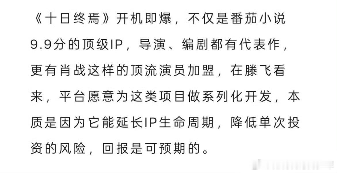 狐厂爆料提到肖战《十日终焉》,开机即爆,因为有肖战这样的顶级演员加盟,并且顶级ip和好班底加持下,肖战是有leader风范的,能够团结团队,凝聚人心,引领队友齐心协力干好一个项目👍🏻平台愿意为了这个项目买单十日终焉