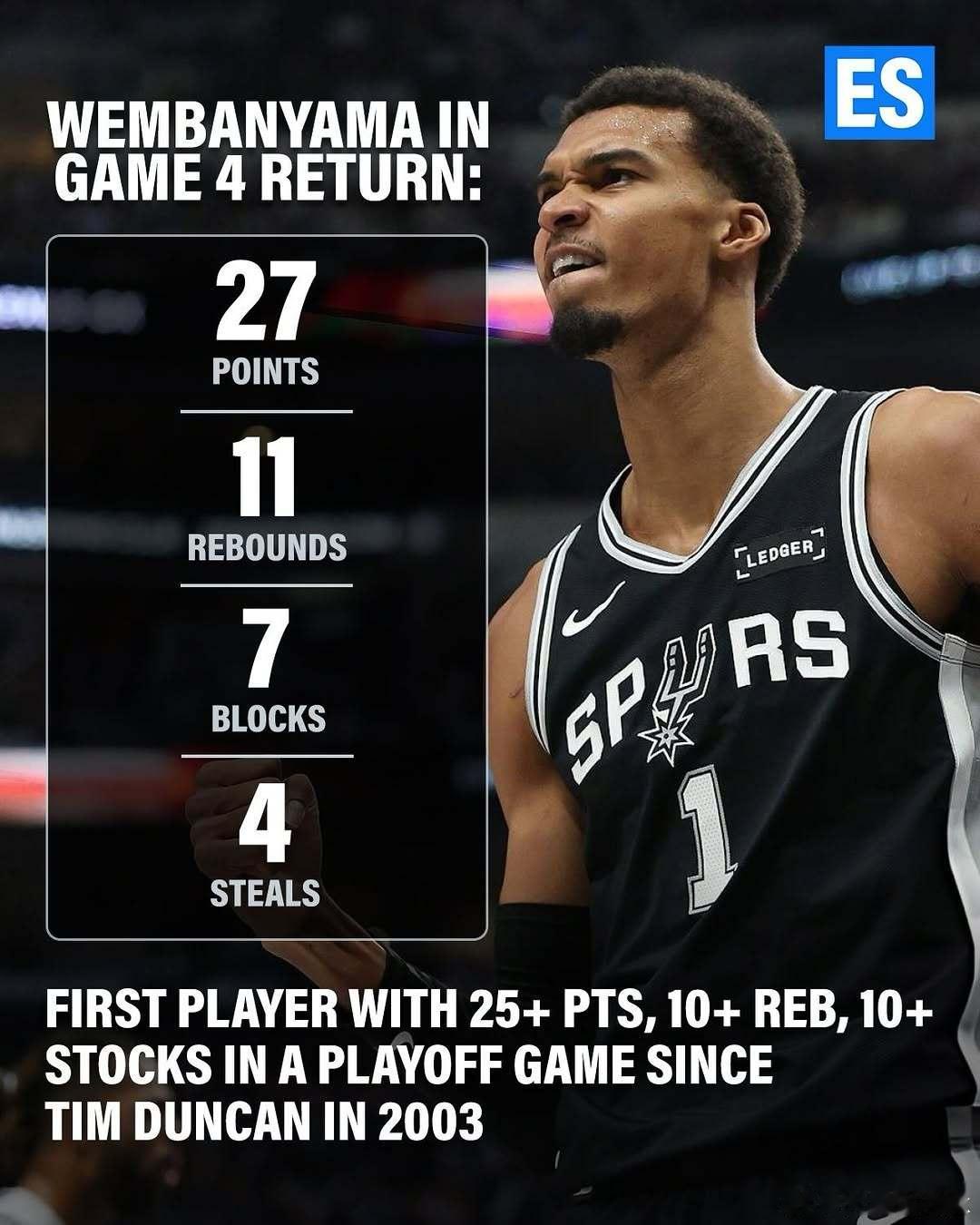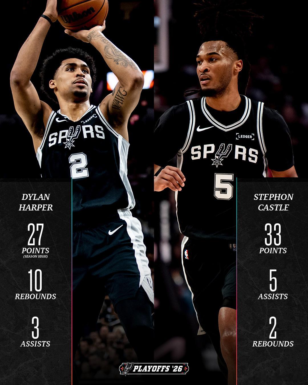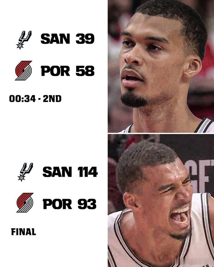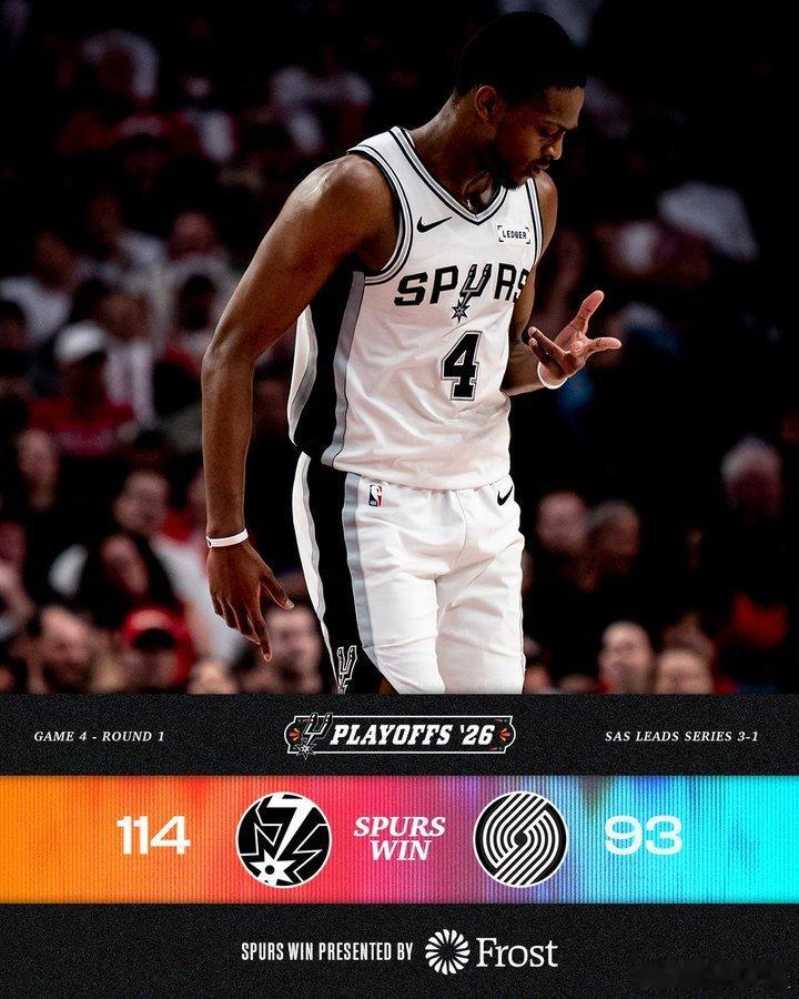 马刺2025-2026赛季NBA 季后赛马刺客场连胜开拓者,大比分3比1。G3马刺最多落后15分,哈珀在下半场砍下22分,成为最年轻的季后赛替补得分超过25分的球员(20岁零53天)。卡斯尔成为马刺队史最年轻的季后赛得到至少30分+5助攻的球员(21岁174天)。G4马刺最多落后19分,下半场73比35是NBA历史上季后赛下半场第二大分差(38分),第一分差是2018年西决G6勇士逆转击败火箭的39分。