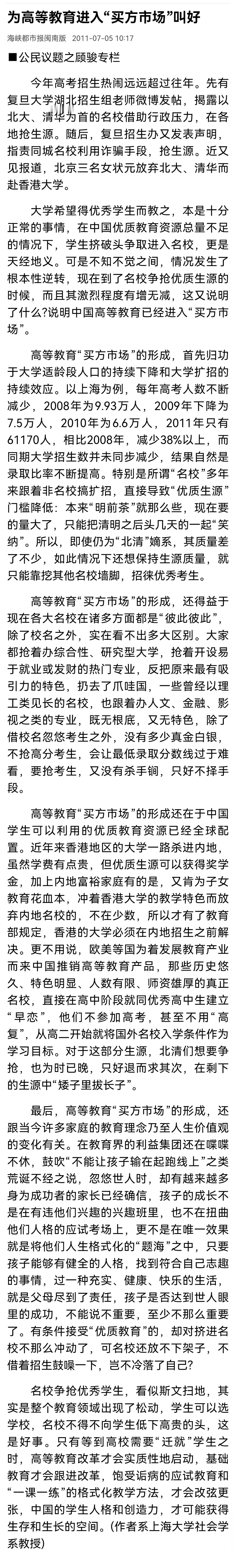早在2011年,就有学者分析指出,我国高等教育进入了买方市场,简单来说,就是受教育者可选择高等教育了。对于教育质量不高的高校,学生可以以脚投票,放弃选择。 然而,我国高等教育真进入买方市场了吗?虽然每年高考,会有学生放弃填志愿、被录取后放弃报到、选择复读,近年来,部分民办本科高校、高职高专招生“遇冷”,但是,绝大部分公办本科院校并没有招不满的压力。 事实上,在过去15年间,我国高校的招生规模从657万(2010年)扩大到了1200万(2024年),然而,高校还在扩招(到2035年前我国高校都会扩招)。这背后的原因是“唯学历”“唯升学”,很多学生上大学追逐的还是一纸文凭,而不是关注接受高等教育的质量。如果不摆脱“学历情结”,不以提升能力、追求高等教育回报率来选择高校,那么,高校并不能真切感受到竞争压力。 这种局面可能要到适龄学生大幅减少,高校招生规模超过出生人口后,才能得到扭转。