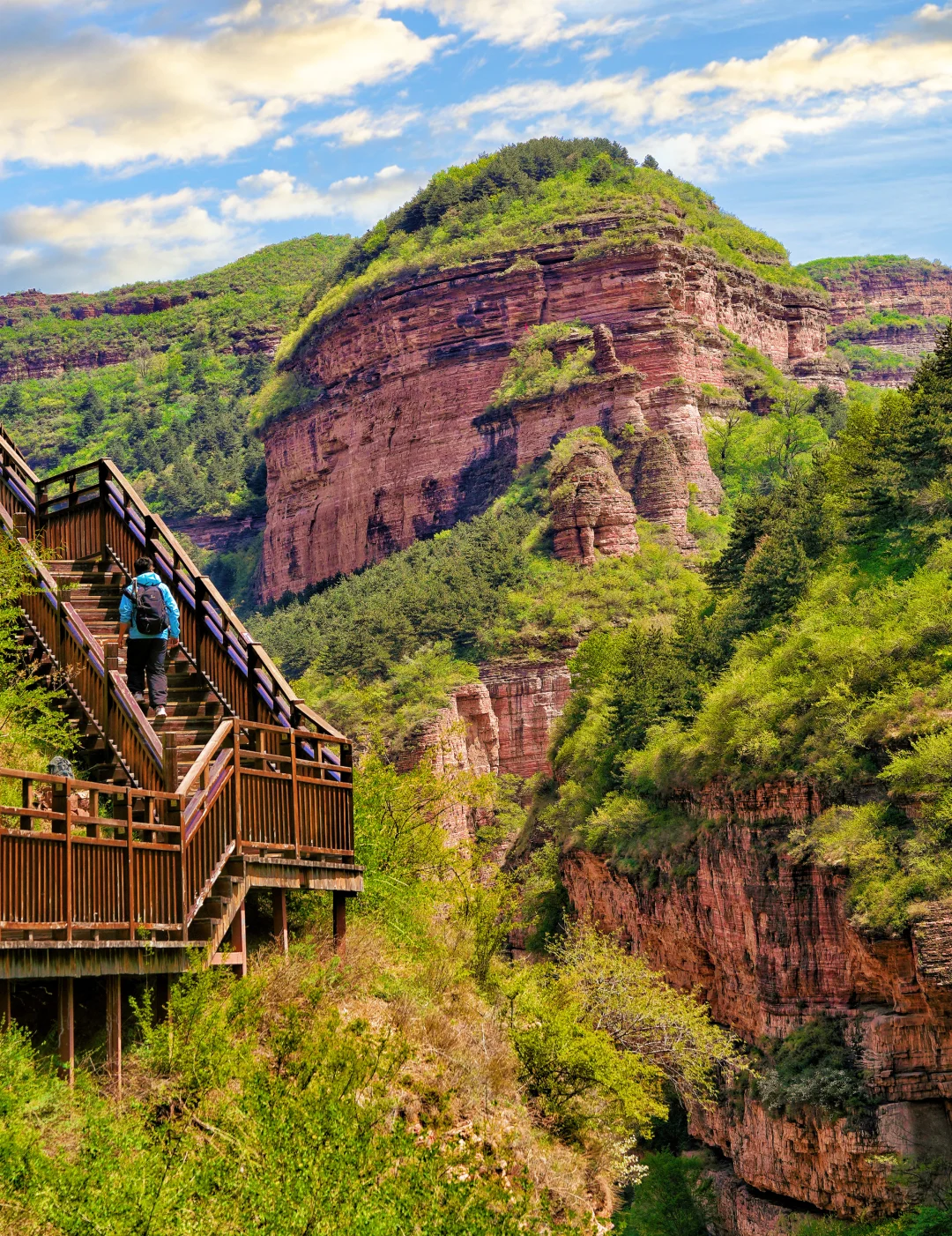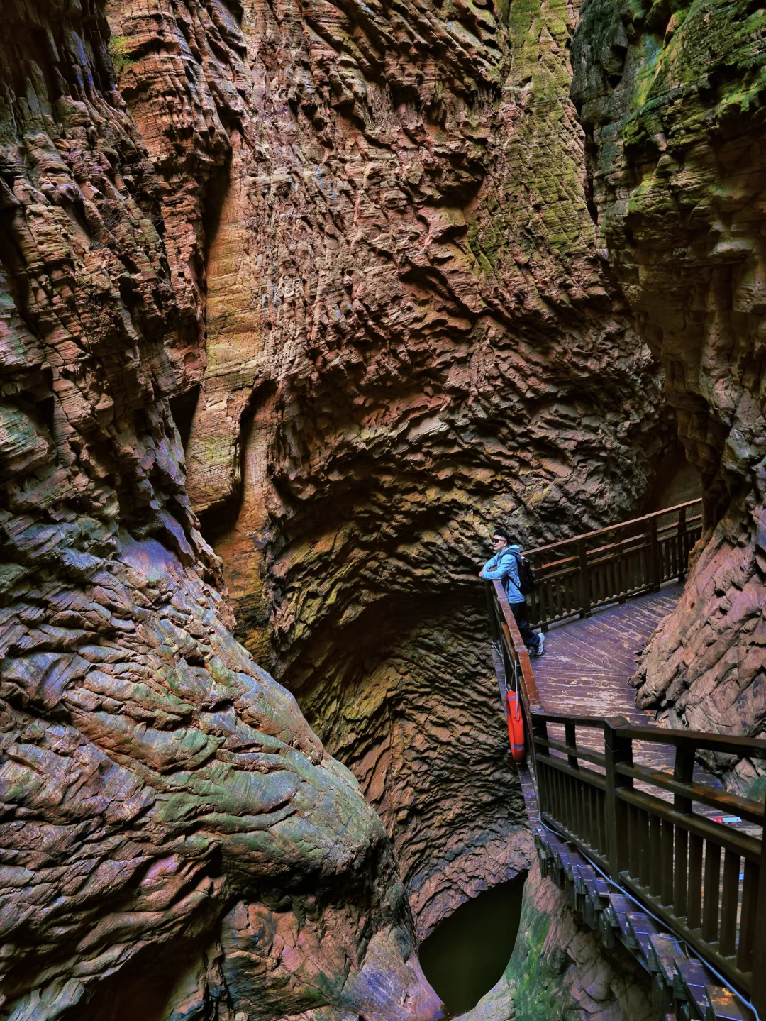 120米高空挂壁电梯,直达崖顶超省力~1.5公里蟠龙栈道,低头是万丈深谷,抬头是赤红绝壁