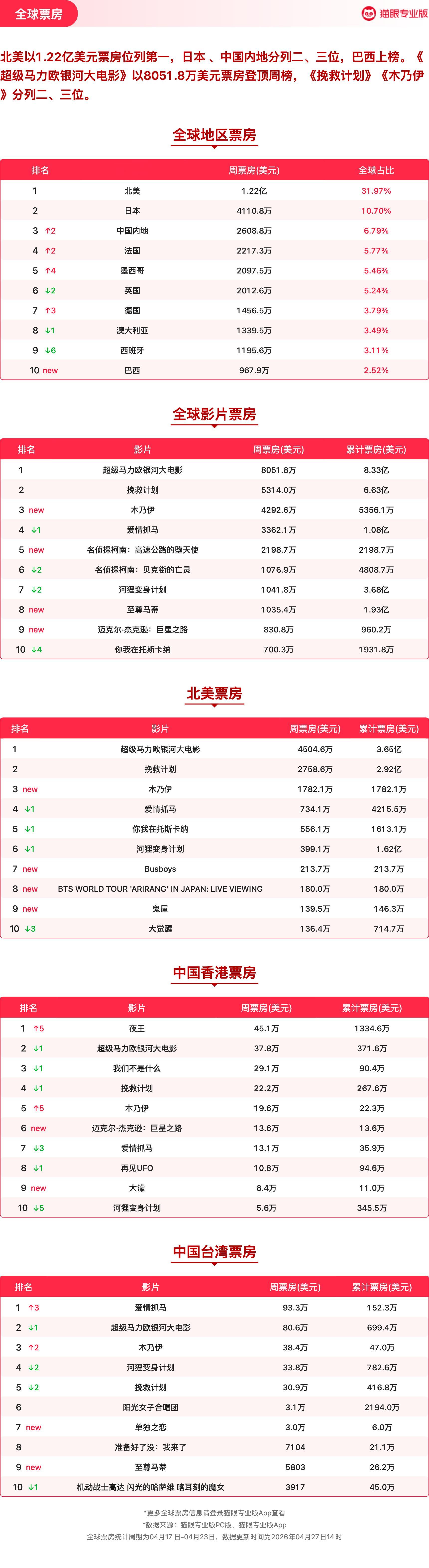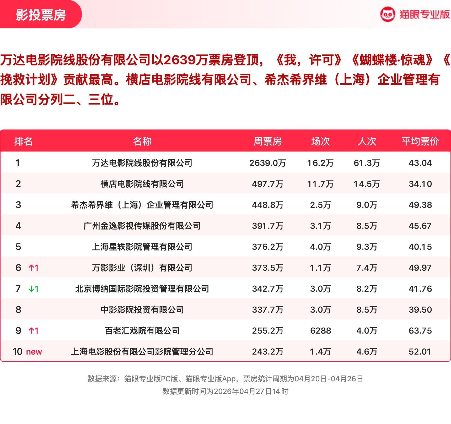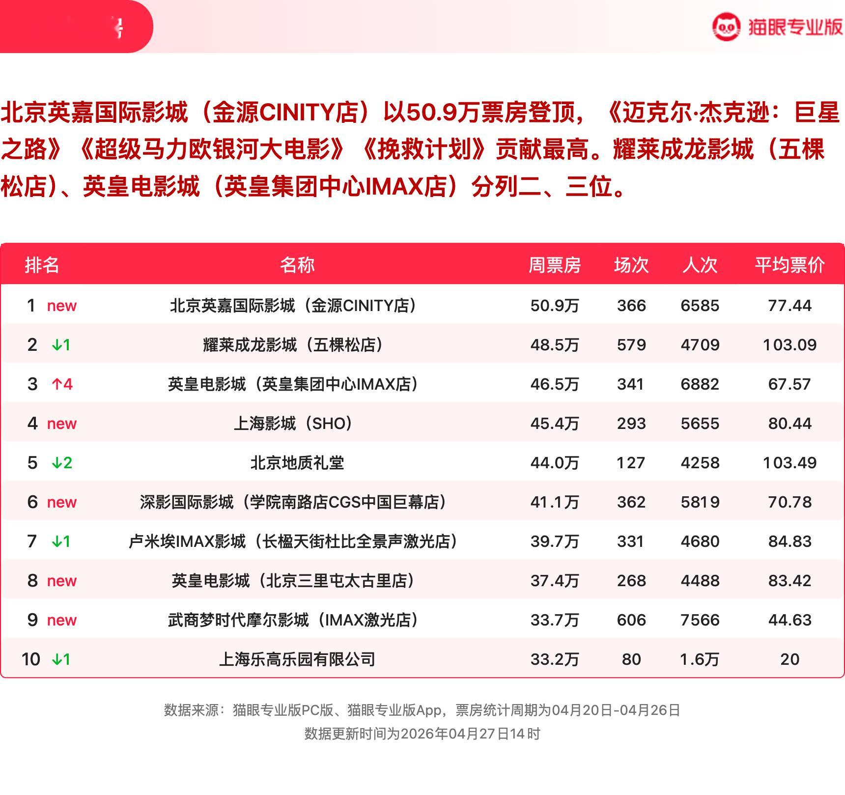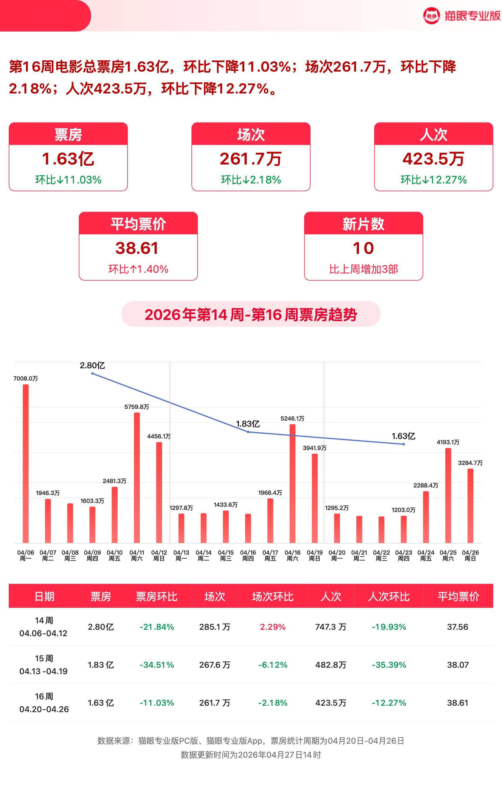 迈克尔杰克逊巨星之路获周冠 猫眼专业版2026年第16周电影周报发布📒:周票房1.63亿,《迈克尔·杰克逊:巨星之路》上映首周登顶票房周榜🏆,《我,许可》《蝴蝶楼·惊魂》分列二三位。猫眼电影行业周报