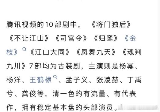 拥有稳定基本盘的头部演员四大平台开机长剧四大平台开机长剧,腾讯10部、爱奇艺芒果5部、优酷四部,拥有稳定基本盘的头部演员,杨幂、杨洋、王鹤棣、孟子义、张凌赫、丁禹兮、龚俊等~