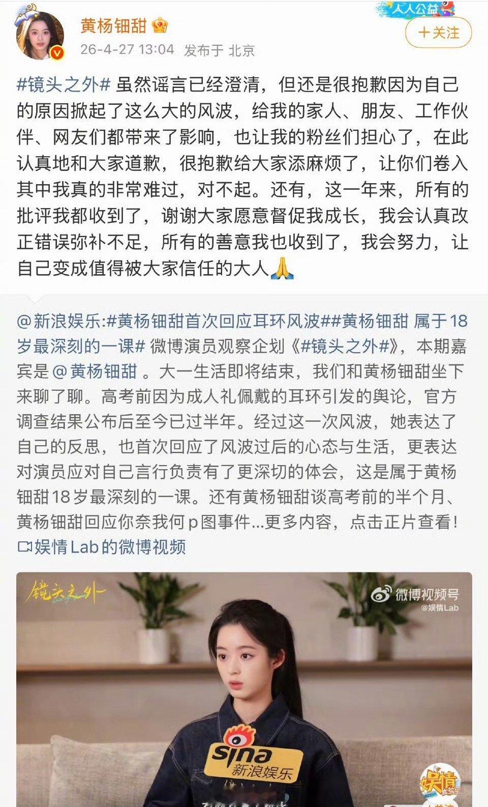 黄杨钿甜的态度黄杨钿甜表态 哇哇哇哇,看得出来黄杨钿甜成长了啊!!!黄杨钿甜在接受采访的时候提到,自己的耳环风波。看得出来黄杨钿甜的态度还挺诚恳的,说自己会努力,成为让人信任的人,一整个诚意满满,未来可期啊!!!