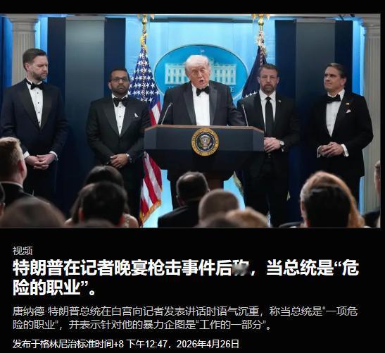 华盛顿枪击案后,特朗普在新闻发布会上突然说了句大实话:早知道当总统这么危险,我就不选了! 当地时间4月25号晚上,华盛顿希尔顿酒店里,白宫记者协会晚宴正热闹举行,这是特朗普上任后第一次出席这场活动,本想借着机会缓和和媒体的关系,没想到,一场突如其来的枪声,把所有的体面都炸得粉碎。 当晚8点多,特朗普刚进入宴会厅没多久,还没等到发表演讲,突然就传来了急促的枪声,现场瞬间乱作一团,几百名记者和政商界人士吓得纷纷趴到地上,大气都不敢喘,谁也没想到,安保号称密不透风的晚宴,会突然出现这样的意外。 特勤局的特工反应倒是够快,立马冲进宴会厅,一边喊着让所有人趴下,一边快速冲到特朗普和他妻子梅拉尼娅身边,架起两人就往安全区域撤离。 有现场记者说,撤离的时候,特朗普还踉跄了一下,看得出来,哪怕见多了场面,他也被这突如其来的枪声吓懵了。 更有意思的是,特朗普后来回忆说,一开始听到响声,还以为是盘子摔碎了,压根没往枪声上想,反倒是他老婆梅拉尼娅,反应比他快多了,一下子就意识到不对劲,率先做好了躲避的准备,不得不说,关键时刻还是女人更敏锐。 这场惊魂事件里,还有一名特勤局特工被击中,好在身上穿了防弹背心,才侥幸躲过一劫,后来查明,枪手是一名31岁的加州男子,名叫科尔·艾伦,带了霰弹枪、手枪,伪装成酒店住客混了进去。 要说这安保也真是离谱,华盛顿希尔顿酒店从当天下午2点就开始关闭,宾客要经过好几道安检才能进入宴会厅,特朗普坐的主桌下面还藏着防弹装甲板,结果还是让枪手带了这么多武器闯进来,要知道,45年前,里根总统就在这家酒店遭遇过未遂刺杀,这么多年过去了,安保还是没跟上。 事发两个多小时后,特朗普回到白宫召开新闻发布会,脸上的惊魂未定还没散去,被问到会不会担心自己的安全时,他罕见地吐了真言,调侃说早知道当总统这么危险,当初可能就不参选了,还开玩笑说,要是国务卿鲁比奥早点告诉他有这么大风险,他也不会往这火坑里跳。 说归说,特朗普还是嘴硬,反复强调枪手离宴会厅很远,自己一直很安全,还夸特勤局这次的表现比上次竞选集会遇袭时好多了。 可明眼人都能看出来,他说这些话,多少有点给自己壮胆的意思,毕竟刚经历过生死瞬间,后背发凉也是难免的。 有人可能不知道,这已经不是特朗普第一次遭遇生命威胁了,去年7月,他在宾夕法尼亚州的竞选集会上,就被一名枪手击中了右耳,至今耳朵还会隐隐作痛,这次晚宴枪击事件,不过是他总统生涯里又一次惊魂时刻。 更讽刺的是,特朗普借着这次事件,还不忘推销自己正在修建的白宫宴会厅,说那地方安保设施完备,有防无人机功能和防弹玻璃,比华盛顿希尔顿酒店安全多了,这波借题发挥,也真是把商人的本性发挥得淋漓尽致。 事件发生后,美国各界都被震动了,民主党和共和党罕见地站在一起谴责这种政治暴力,连英国首相、法国总统都纷纷表态,觉得这样的枪击事件不可接受。 可谴责归谴责,在美国,枪击事件早就成了常态,连总统出席的活动都能发生枪击,普通民众的安全更是无从谈起。 说来说去,特朗普这句“早知道不选总统”,看似是玩笑,实则藏着太多无奈。身为超级大国的总统,本该是高高在上、风光无限,可如今却要天天活在被刺杀的恐惧里,连参加一场晚宴都要提心吊胆,这大概就是美国政客的悲哀吧。 大家对此事有什么看法呢?欢迎各位在评论区留言!