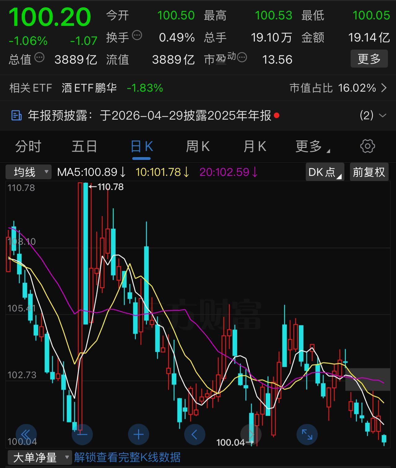 五粮液明天还守得住百元大关吗? 2026.03.23,五粮液最低到100.04元,今天最低到100.05元。整个下午在几分钱之內波动,就是不破百。 不服不行,是否有一股力量,就是在100的临界点,有多少卖单都接。 果然如此的话也不见得是好事:被严重格式化,也不大可能上涨,有可能在100-110元之间搞个一两年, 其实,尽管这几年五粮液从三百多跌列到百元,但是,年线来看,五粮液还在半山腰,在消费持续低迷的情况下,要想重拾升势,够难的。