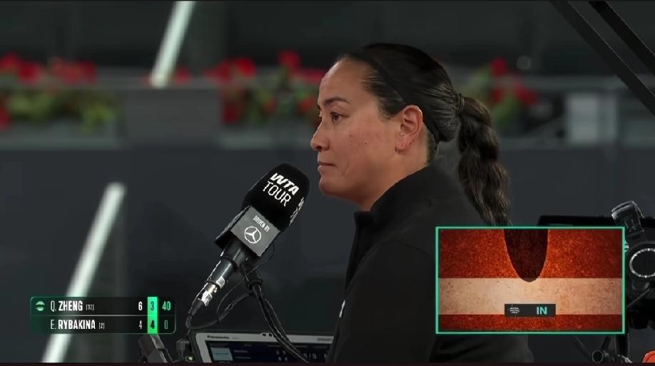 马德里公开赛上郑钦文vs莱巴金娜这场比赛中极具争议性的一幕! 疑似电子司线发生了错判,郑钦文的击球是肉眼可见的回出了界外,可电子司线显示的是压线好球,这个回球就在莱巴脚下,她当然不服,提出让主裁下来看一下,主裁以规则不允许为由,拒绝下去查看球印,这让一向平淡如菊的莱巴也是大光其火…… 咱也不知道电子司线的判罚依据是什么?据说是要通过物理建模计算得出的。而以往的比赛中,特别是红土赛事,很多球员遇到过类似莱巴的事情,也都提出过质疑,可最后还是以电子鹰眼为准。可到底球印是对的,还是电子鹰眼计算出来的才是对的,我们外行人真的说不好!