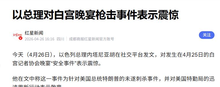 白宫发生枪响,内塔尼亚胡和赖清德深感震惊? 4月25日,华盛顿希尔顿酒店里正在举办白宫记者协会晚宴。西装革履的政要们刚拿起刀叉,准备享用那道早就摆好的沙拉,突然几声沉闷的巨响划破了宴会厅的优雅氛围。 一开始有人以为是哪个服务员手滑摔了托盘,直到特勤局特工们像离弦之箭般冲向主席台,高喊着"安全警报",整个大厅才瞬间炸开锅。一千六百多名宾客,上至总统下至记者,纷纷丢掉矜持,以最快速度钻到桌子底下,场面一度十分混乱。 特朗普后来在新闻发布会上表示,特勤局人员反应迅速,第一时间将他和第一夫人护送至安全地点,他对特勤局的专业处置表示感谢。第一夫人梅拉尼娅同样被特工迅速护着撤离,整个过程有序高效。 副总统万斯与其他政要一样,在特勤局特工护送下快速撤离现场,这是标准的安全撤离程序,所有人员均遵循特工指示迅速转移至安全区域。 枪声来自酒店大堂一处特勤局检查哨卡,一个叫科尔・托马斯・艾伦的31岁加州男子带着两把枪支和多把刀具强闯关卡,被特勤局当场拿下。 一名特工手臂被弹片轻微划伤,无生命危险,所有安保人员均未被子弹直接击中。这场本该是谈笑风生的政治盛宴,就这么变成了一场惊魂夜。 消息像长了翅膀一样传遍全球,最"迅速"的两个声音,却来自万里之外的两个地方——以色列和台湾地区。 以色列总理内塔尼亚胡几乎是第一时间在社交平台发声,直接把这事儿定性为针对特朗普的"未遂刺杀",字里行间全是"震惊",还不忘夸赞特勤局反应迅速。这表态来得又快又狠,比美国自己的官员都要果断。 要知道,内塔尼亚胡现在正和特朗普政府在黎以停火、伊朗问题上保持紧密合作,两国关系处于密切互动的微妙时刻。这个节骨眼上美国老大要是出点什么事,以色列在中东的日子可就不好过了。 内塔尼亚胡的快速表态,反映出以色列对美以关系稳定性的高度重视。毕竟,以色列在中东的各种行动,背后都离不开美国的支持,要是换个总统,政策一变,之前的努力可能就全白费了。 更有意思的是台湾地区领导人赖清德,枪击发生不到24小时,他就用英文在社交平台发了声明,同样是"深感震惊并严重关切",还"欣慰无人受伤",最后不忘"强烈谴责一切形式的暴力行为"。 这就有点耐人寻味了。白宫到台北直线距离一万多公里,这场枪击跟台湾八竿子打不着边,赖清德却比谁都积极表态。就在不久前,台防务部门刚签下一笔天价军购合同,把台湾老百姓的血汗钱大把大把送给美国军火商。 现在美国主子家里出了点状况,作为"买办"的赖清德自然要第一时间表忠心,生怕别人不知道他跟美国的"特殊关系"。 他的快速回应,体现了台湾当局与美国保持紧密联系的政治考量,也是做给岛内那些"倚美谋独"的人看的。意思很明确:你们看,我跟美国关系铁着呢,美国老大有事,我比谁都关心。可这种刻意的讨好,在明眼人看来,不过是一场拙劣的政治表演。 这两个"快速回应"的背后,其实都是各自的政治考量。内塔尼亚胡要的是美国在中东的持续支持,帮他稳住以色列的地区地位;赖清德要的是美国的"安全承诺",给"台独"分裂活动撑腰打气。他们嘴里的"震惊",更多是出于对自身利益的担忧。 更讽刺的是,这两位"震惊"的政客,自己手上都沾着不少争议。内塔尼亚胡政府在加沙的军事行动,造成了大量平民伤亡,这一事实引发国际社会广泛关注;赖清德推动"台独"分裂活动,不断加剧两岸紧张局势,严重威胁台海和平稳定。 这场白宫晚宴的枪声,不仅暴露了美国社会的分裂和暴力问题,也让我们看清了某些政客的真实面目。那些口口声声"震惊"的人,不过是在为自己的利益演戏。真正值得"震惊"的,是他们这种把政治利益凌驾于生命之上的冷漠,以及为了达到目的不择手段的虚伪。