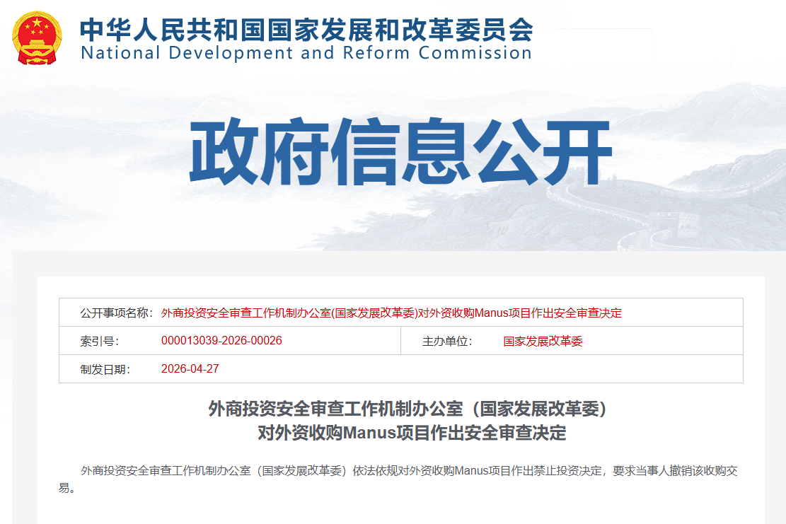 【国家发改委:依法依规对外资收购Manus项目作出禁止投资决定】外商投资安全审查工作机制办公室(国家发展改革委)依法依规对外资收购Manus项目作出禁止投资决定,要求当事人撤销该收购交易。(发改委)