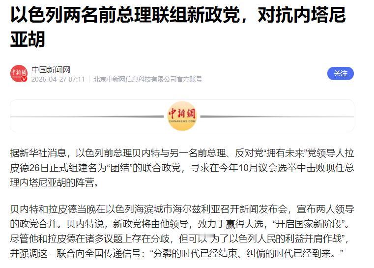 当地时间4月26日,以色列政坛出大事了! 前总理贝内特直接宣布,他的“贝内特2026”党,和另一位前总理拉皮德的“拥有未来”党,合并成了一个新党,叫“团结”党,贝内特当老大。 两人当天晚上就开了新闻发布会,说得明明白白,就是要在今年10月的议会选举里,把现任总理内塔尼亚胡赶下台,还说要给以色列搞点实在的改革。 本来内塔尼亚胡的日子就够难了,这一下更是雪上加霜,内忧外患全凑一块儿了。 说真的,内塔尼亚胡现在的处境,差到不能再差了。先看国内,他手下的执政联盟早就散架了,之前因为征兵的事,两个极右翼的党直接退出了,就因为内塔尼亚胡没兑现承诺,没让极端正统派的犹太人不用当兵。 这一下,他在议会的支持席位就剩60席,刚好一半,想办点事都没人支持,纯属巧妇难为无米之炊。 更让他头疼的是,他自己还背着贪腐案。2020年就被起诉了,罪名有三个:受贿、欺诈、不守信用,这案子拖了6年,今年4月法院终于发传票,让他出庭作证。 这案子要是判了,他总理别想当了,还得坐牢,也难怪有人说,他现在宁愿打仗,也不想去坐牢。 老百姓也不待见他,最新民调显示,一半多的人反对他参选,支持他的还不到一半。跟贝内特比起来,两人差距就2个百分点,稍微有点变动,他就可能被超过。而且贝内特这边的席位,就比他少1席,局势真的悬得很。 国外的麻烦也不少,国际刑事法院早就要抓他,匈牙利新政府更是放话,他敢去就直接逮捕。 沙特也说了,只要内塔尼亚胡还在台上,就不跟以色列建交,还有57个国家支持沙特的态度。 就连美国也不惯着他,白宫官员私下都骂他“像个疯子”,不支持他的政策,他的日子更难了。 再说说贝内特和拉皮德,他俩不是第一次合作了。2021年,就是他俩联手,把内塔尼亚胡赶下了台,只不过当时的联合政府没撑住,18个月就散了,内塔尼亚胡才重新上台。 这次再联手,就是吸取了上次的教训,知道只有团结起来,才能斗得过内塔尼亚胡。 贝内特以前还是内塔尼亚胡的手下,当过他的幕僚长,后来自己单干,他比内塔尼亚胡还激进,能拉来不少右翼选民。 拉皮德是中间派,能吸引普通老百姓,两人联手,覆盖面就广了,对内塔尼亚胡来说,就是最大的威胁。 现在离选举还有半年,内塔尼亚胡肯定不会坐以待毙,说不定会更激进,或者搞点外交、军事动作转移注意力,但不管他怎么做,这次两大反对党合并,已经让他的连任之路难上加难。 说到底,内塔尼亚胡现在内有贪腐案、民众不满,外有国际压力,还有强劲对手,想继续当总理,几乎没可能,10月的选举,就看他能不能翻盘了。