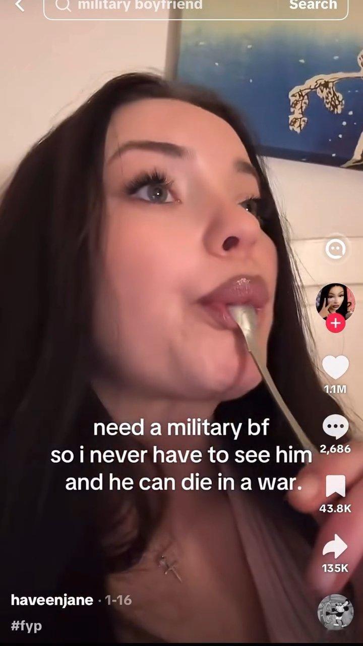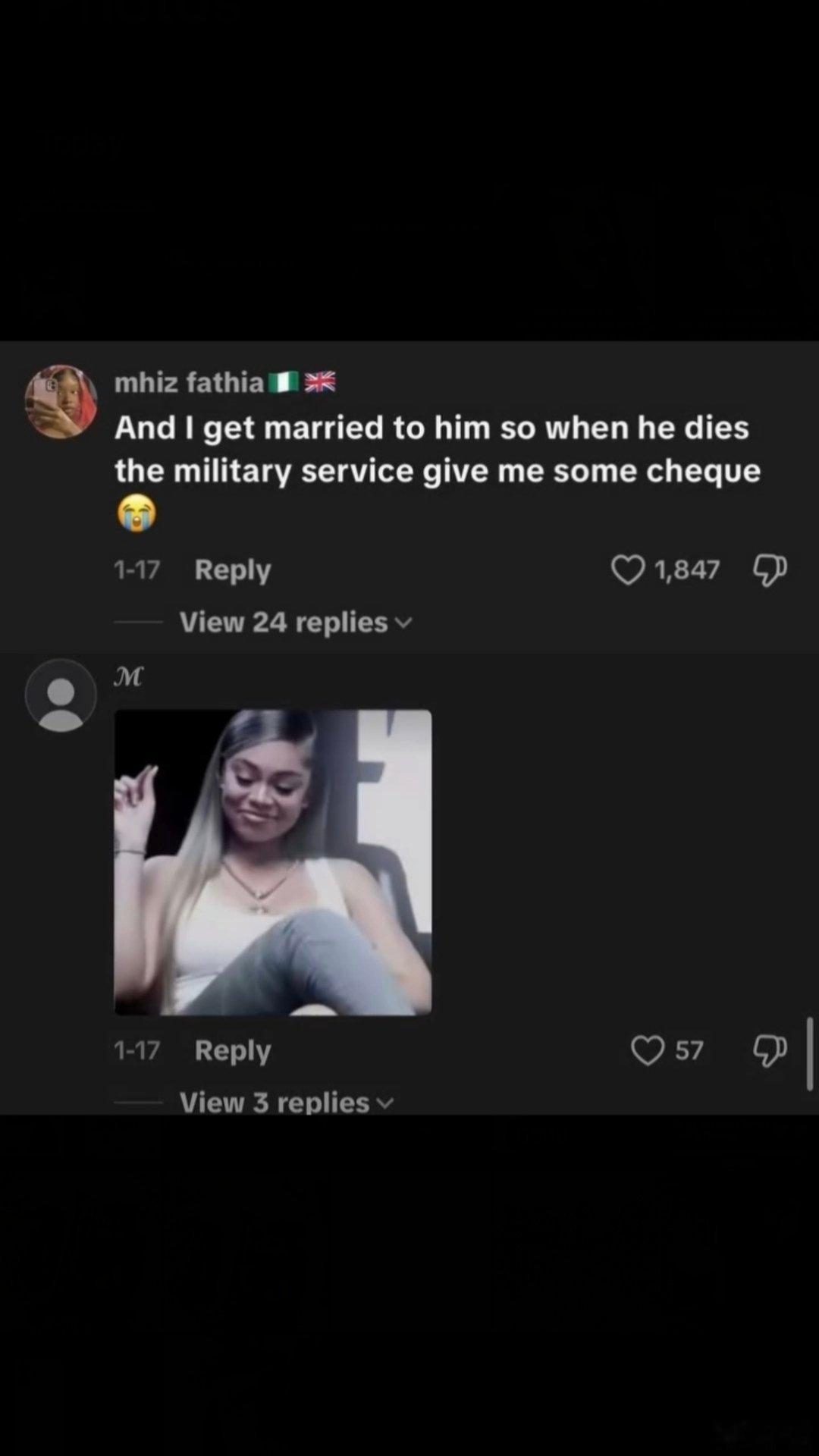 一个英国女性在Tiktok说:“需要一个军人男友,这样我就永远不用见到他,他可以战死沙场。”获得了110万赞。高赞的评论是这样的:“嫁给他,这样他死后军队就能给我发支票”。“我安心的生活,而他可以安息。”“这样我可以一直出轨”。信息发达世界的好处是,让你可以看到各种奇形怪状的人和非人,让你也知道,有些人不仅邪恶,甚至不吝于把它们的邪恶公之于众。也让你知道,国内有些奇奇怪怪的思想都是有源头的。